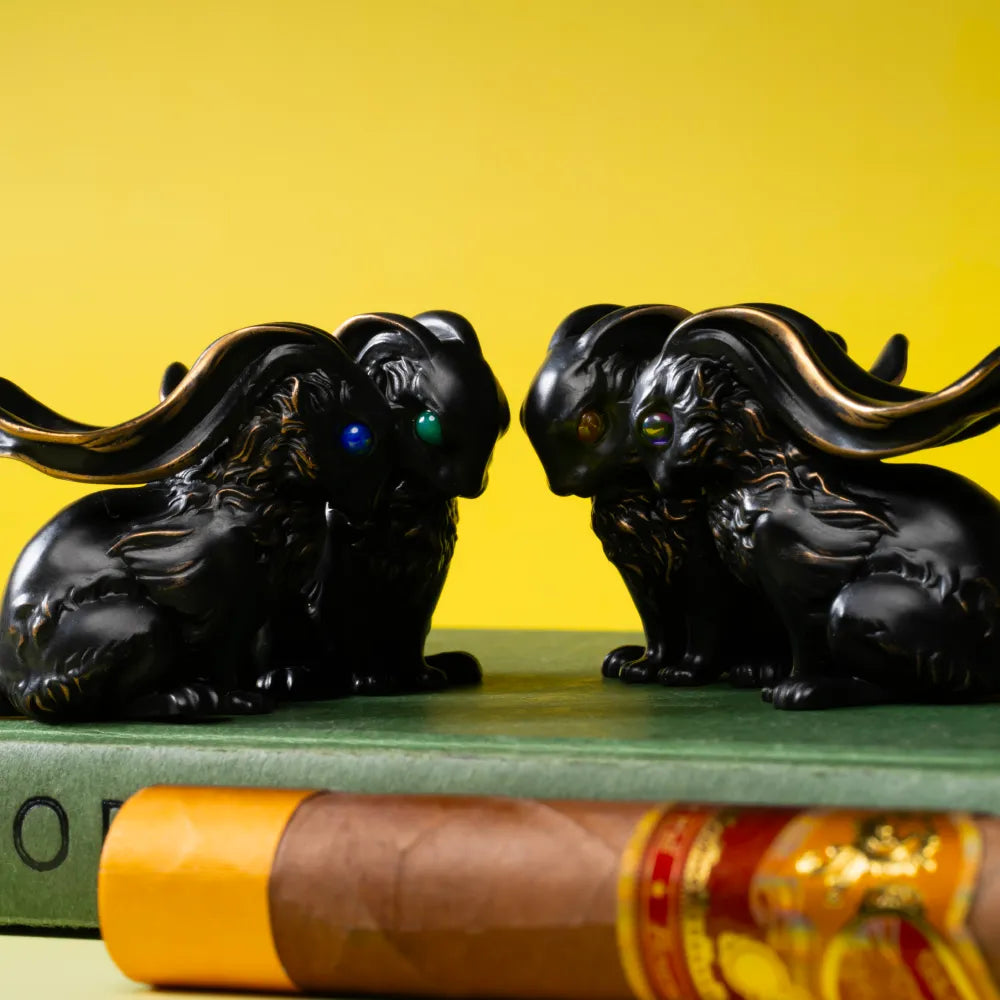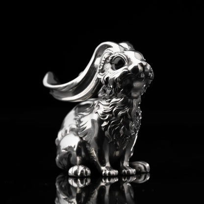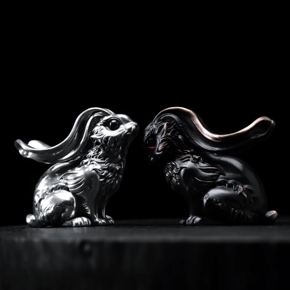 Shaped in a classic European sculpture style, every inch of this piece is carved with precision—each strand of fur polished to create the look of movement and vitality. It's cast in solid white brass, giving it a cool, sacred feel. Hand-set 4mm black onyx stones bring life to its gaze—mysterious and soulful. A hidden mechanism at the tail opens up to store small trinkets or crystals, while its raised ears are thoughtfully designed to hold pens, cigars, or other slim objects. Function meets art in the most graceful way.