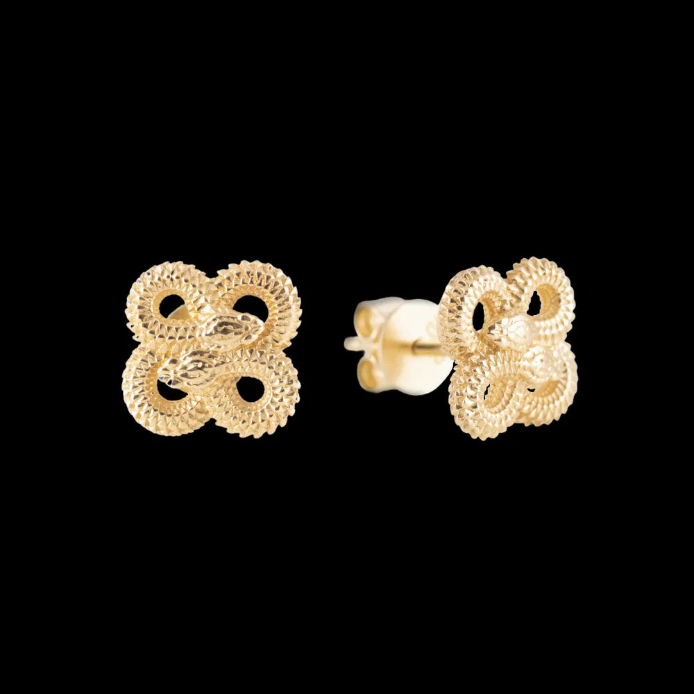 Crafted with ingenuity, the earrings feature two snakes gracefully entwined, evoking the imagery of a lucky four-leaf clover, symbolizing good fortune. Each meticulously visible snake scale harmonizes seamlessly with the hoop's design elements, creating a cohesive and visually captivating aesthetic.