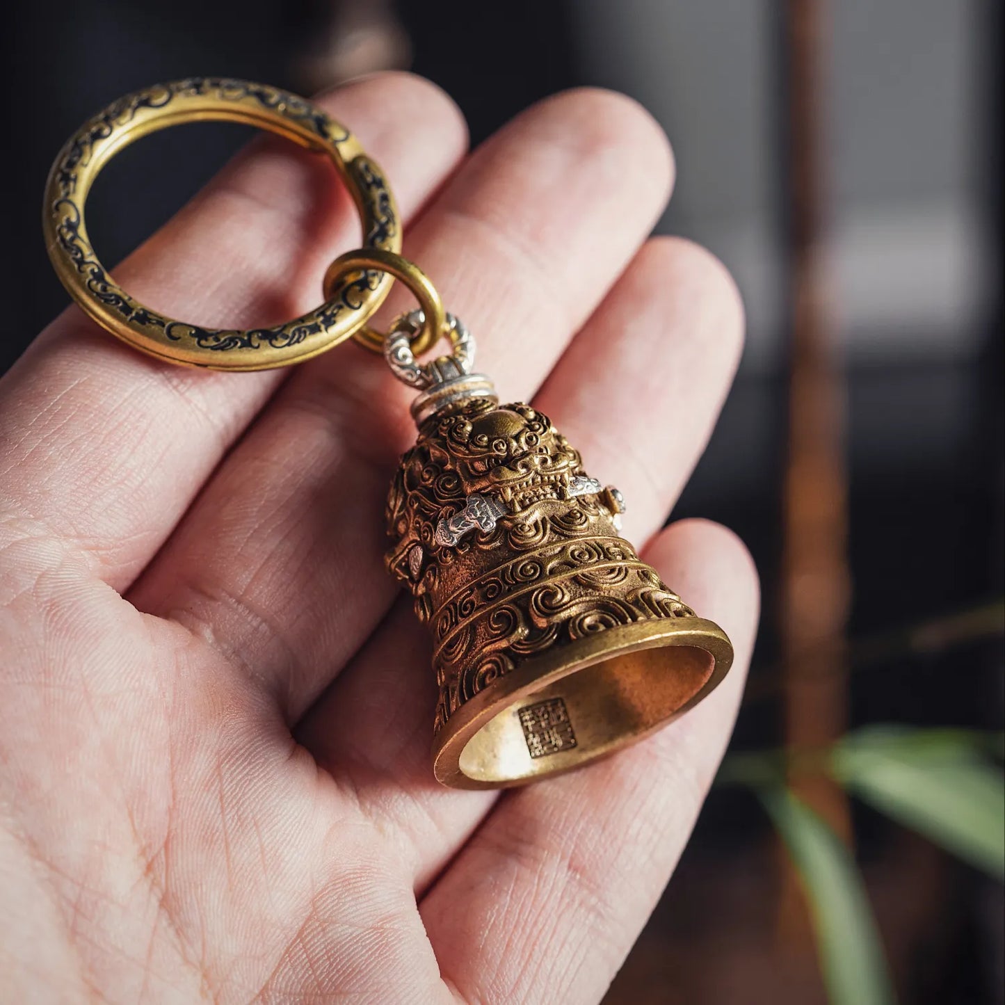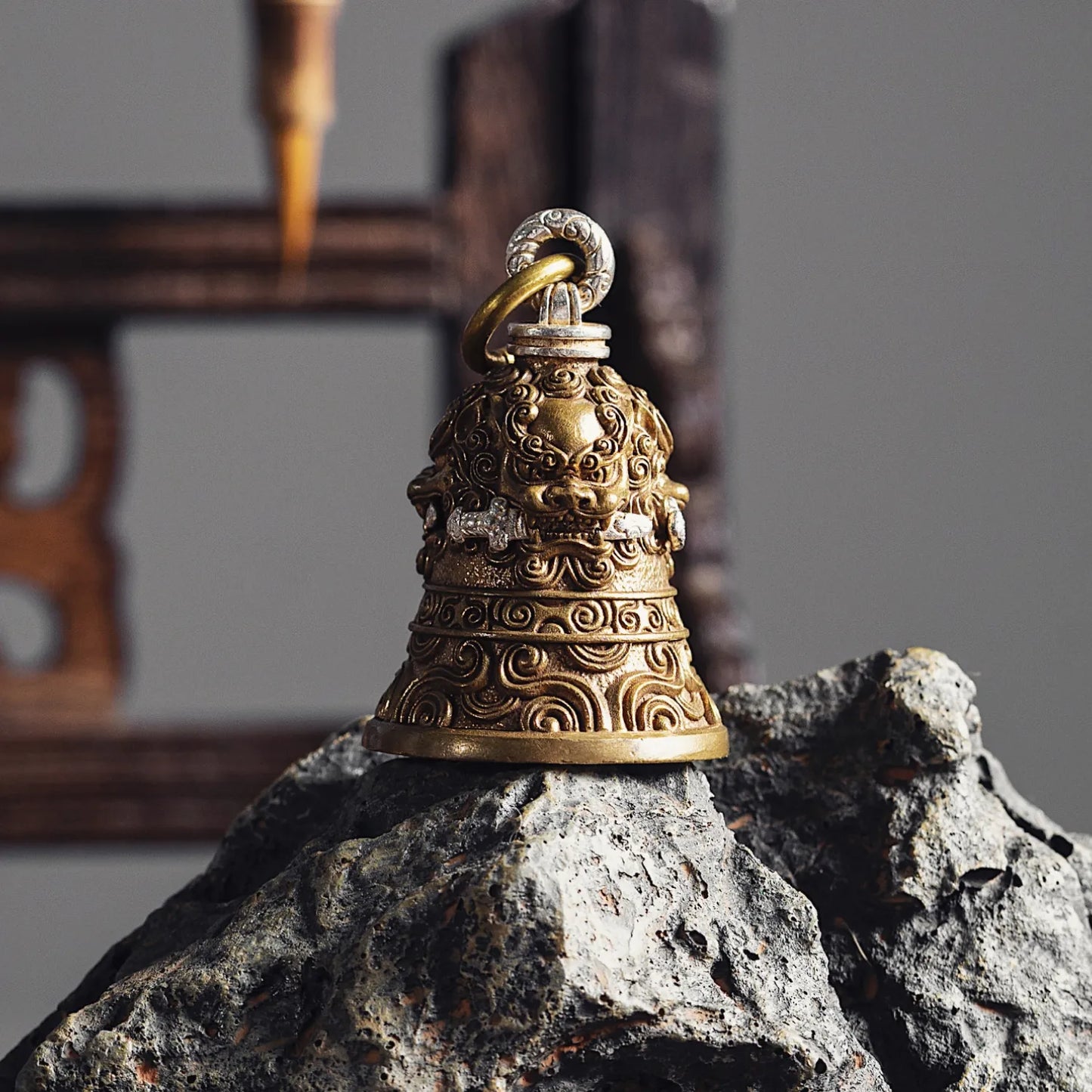 Crafted with meticulous attention to detail, this bell features a majestic lion holding a precious sword in its mouth, surrounded by traditional sea water and auspicious cloud patterns. The bell emits a crisp yet gentle sound, enhancing its allure and adding to its auspicious aura. Each element is intricately designed to ensure clarity in texture and richness in detail.