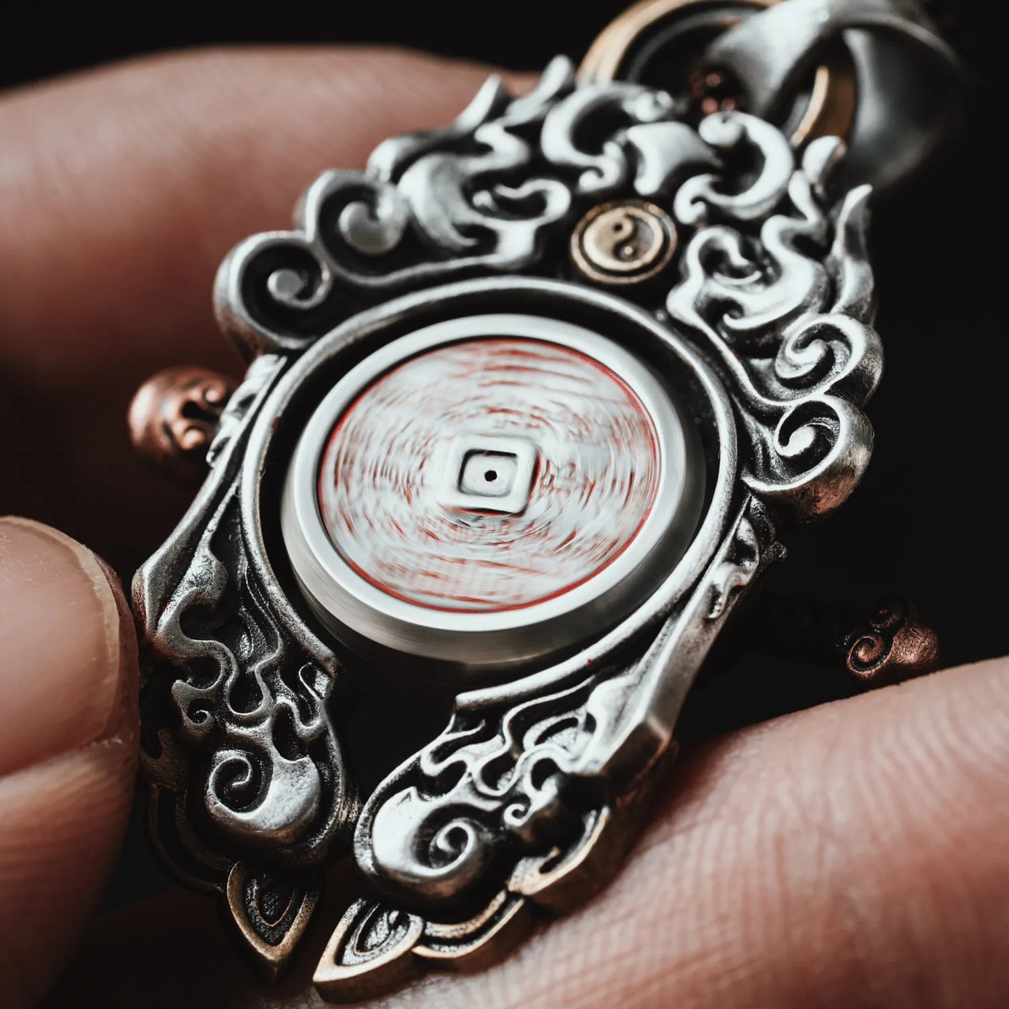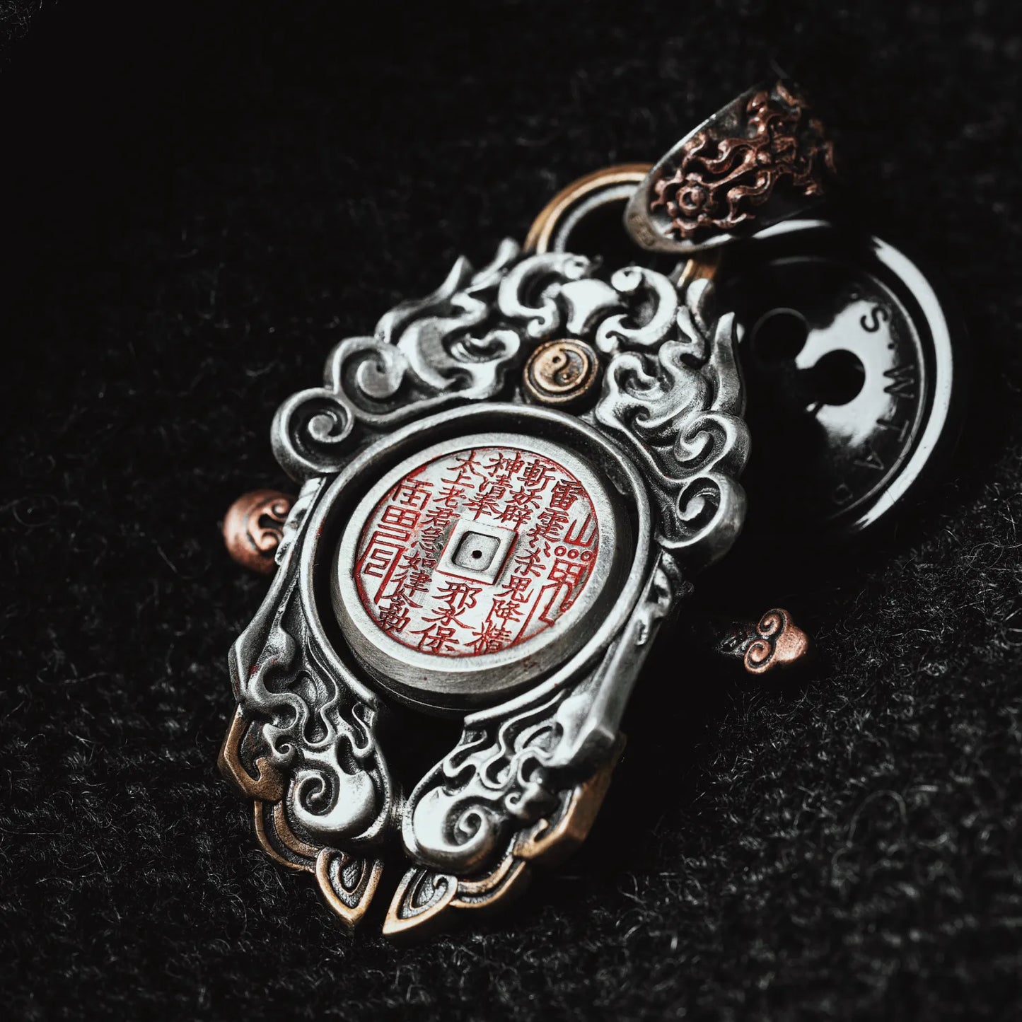 The Lion Biting Sword is a revered guardian symbol in the Fujian and Taiwan cultural regions, dating back to the Ming and Qing dynasties. It was believed that wherever there were Fujianese people, there was the protection of the Sword Lion, found on ancestral halls, temples, doorways, and even personal accessories to ensure safety and prosperity. This pendant merges two powerful symbols—the Sword Lion and the Shan Gui Coin—creating a fusion of blessings. The rotating Shan Gui Coin adds an interactive element, symbolizing fortune in motion—literally "turning wealth."