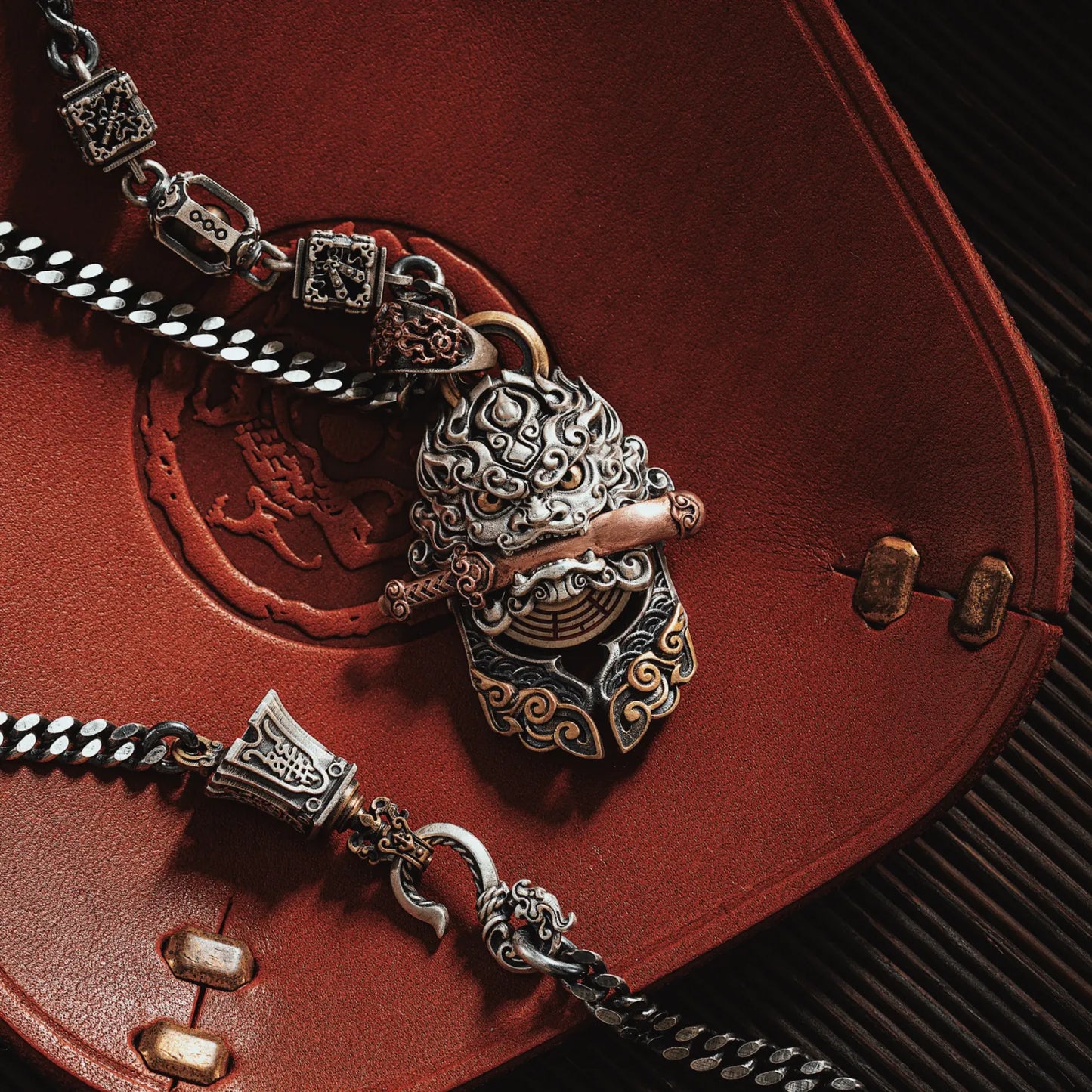 With ingenious handmade design, the pendant is composed of S925 silver, brass, and copper, intricately assembled from 13 individual parts. Every piece is hand-set and meticulously finished, undergoing a series of polishing, aging, and shaping processes. The Sword Lion fiercely grips the blade, its intense gaze exuding power and protection. The rotating Shan Gui Coin at the back enhances playability while carrying the traditional belief of attracting wealth. Rich with heritage, the pendant is adorned with wave, cloud, and flame motifs, creating an ornate and commanding presence. A touch of cinnabar is carefully applied, symbolizing health, peace, and auspiciousness.