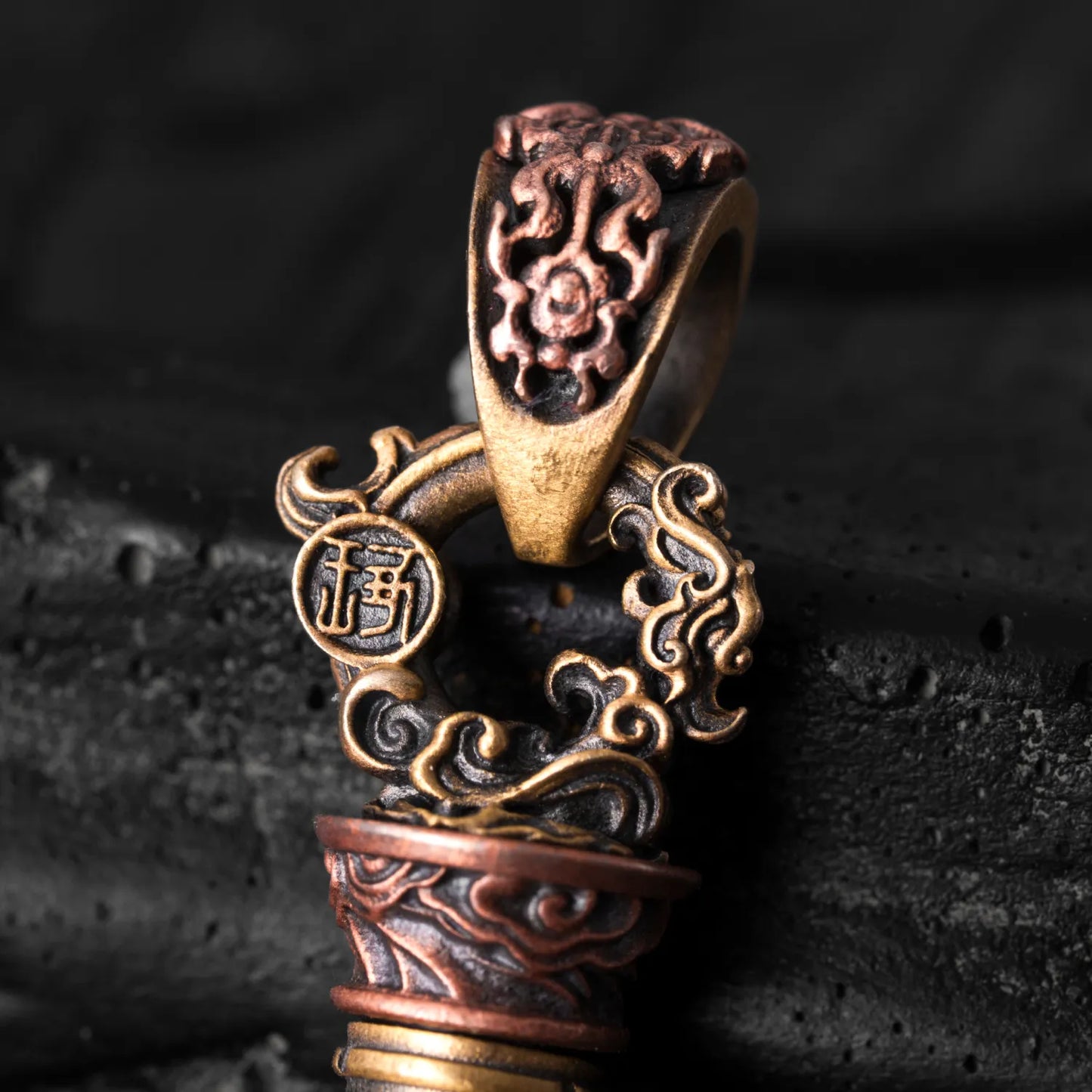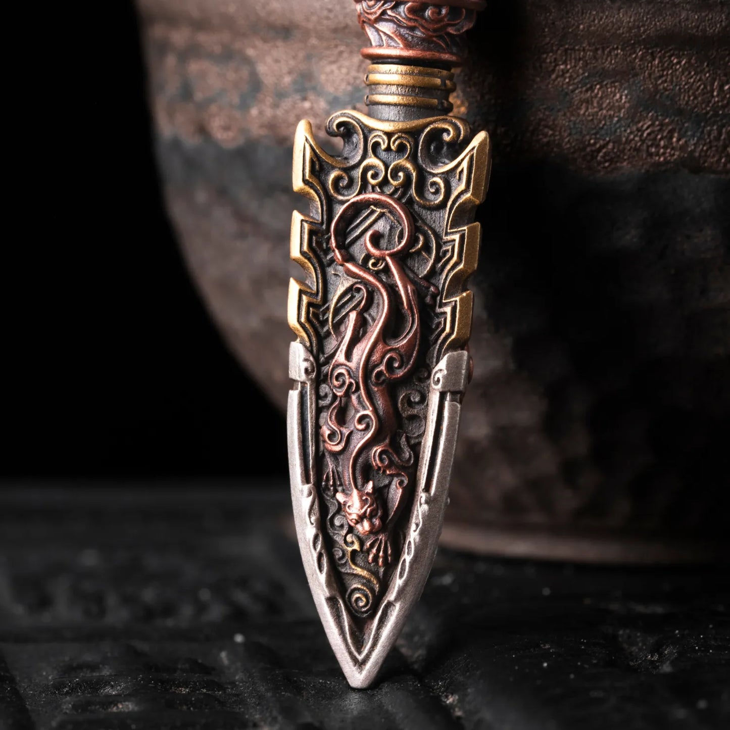 Crafted with meticulous attention to detail, the pendant boasts a fusion of metals that showcases unparalleled craftsmanship. The intricate motifs of the tiger, dragon, and crane are meticulously etched onto each side, creating a mesmerizing display of cultural significance. Its multi-metal construction not only adds depth but also elevates its aesthetic appeal, making it a true masterpiece of artistry.