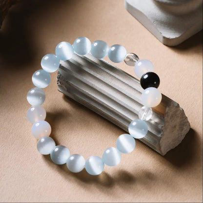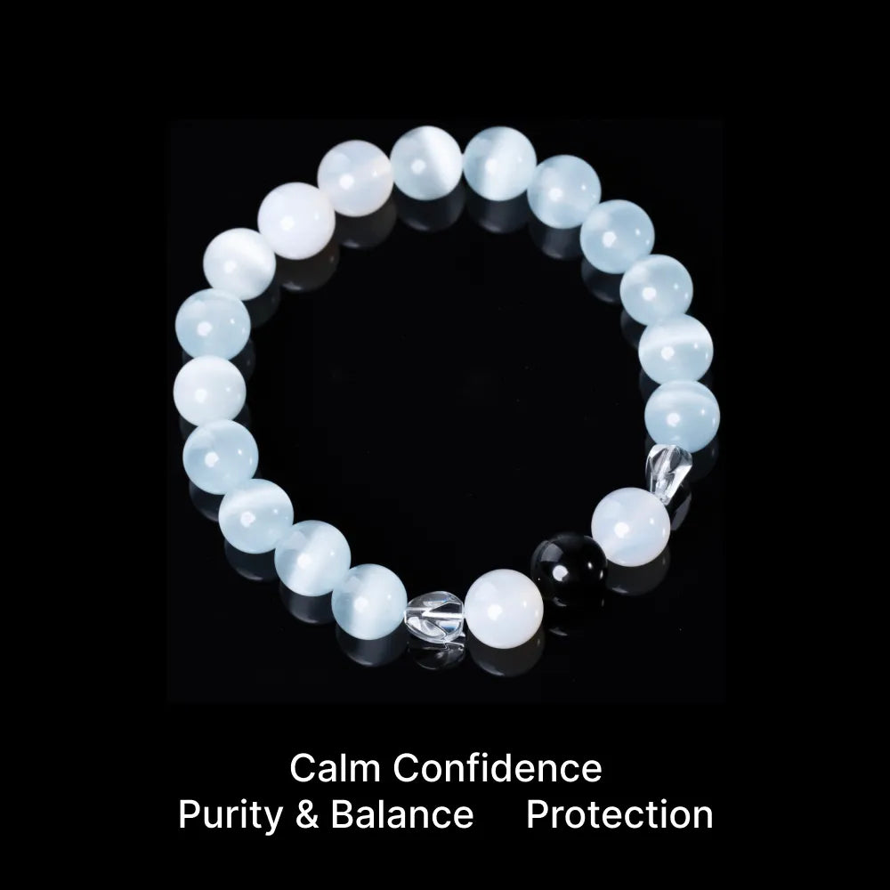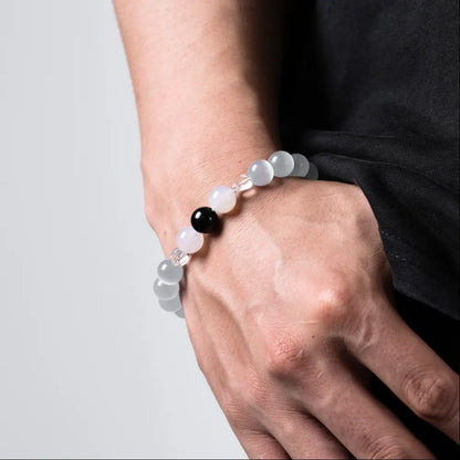 This powerful healing crystal bracelet combines the calming properties of White Agate with the grounding energy of Obsidian, while the shimmering White Tiger's Eye enhances focus and inner strength. The clear Ice Cube spacers bring a refreshing visual and symbolic touch of clarity and peace.