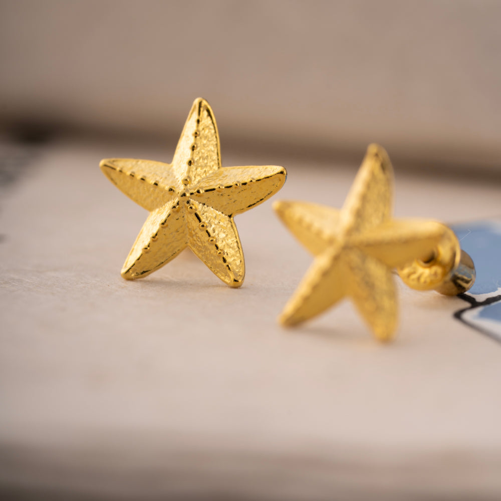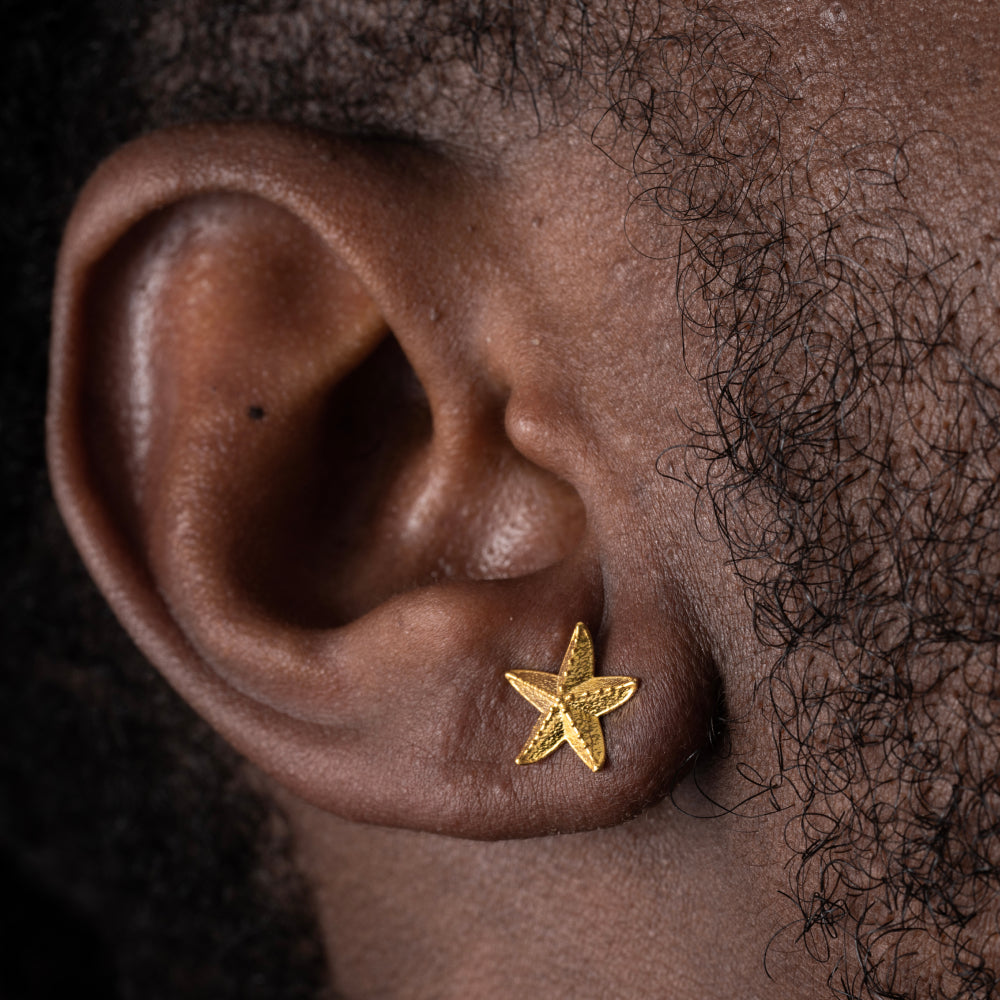 Made from 18K Gold Vermeil the earrings boast an ingenious design, fusing the starfish's essence with the pentagram's symmetry. Slightly raised edges and textured bumps on the pentagram surface emulate the starfish's natural appearance. As versatile earrings, they are suitable for both men and women. Wear them as a charming accessory or embrace the symbolism of luck and protection.