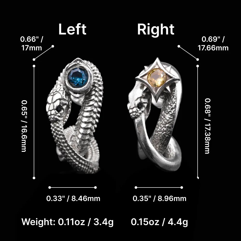 Meticulously handcrafted, each earring showcases a unique design philosophy. The realistic stud captures every intricate scale, while the abstract counterpart blends celestial textures with minimalistic details. The interplay of star-set aquamarine and fiery yellow gemstones creates a stunning contrast, offering both depth and dynamism. Precision-set 0.8mm micro-gems bring the serpent's eyes to life, adding an undeniable intensity to the piece. Crafted from S925 sterling silver, these earrings are hypoallergenic, durable, and lightweight for everyday wear.