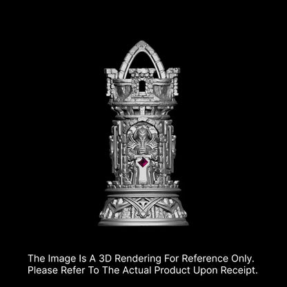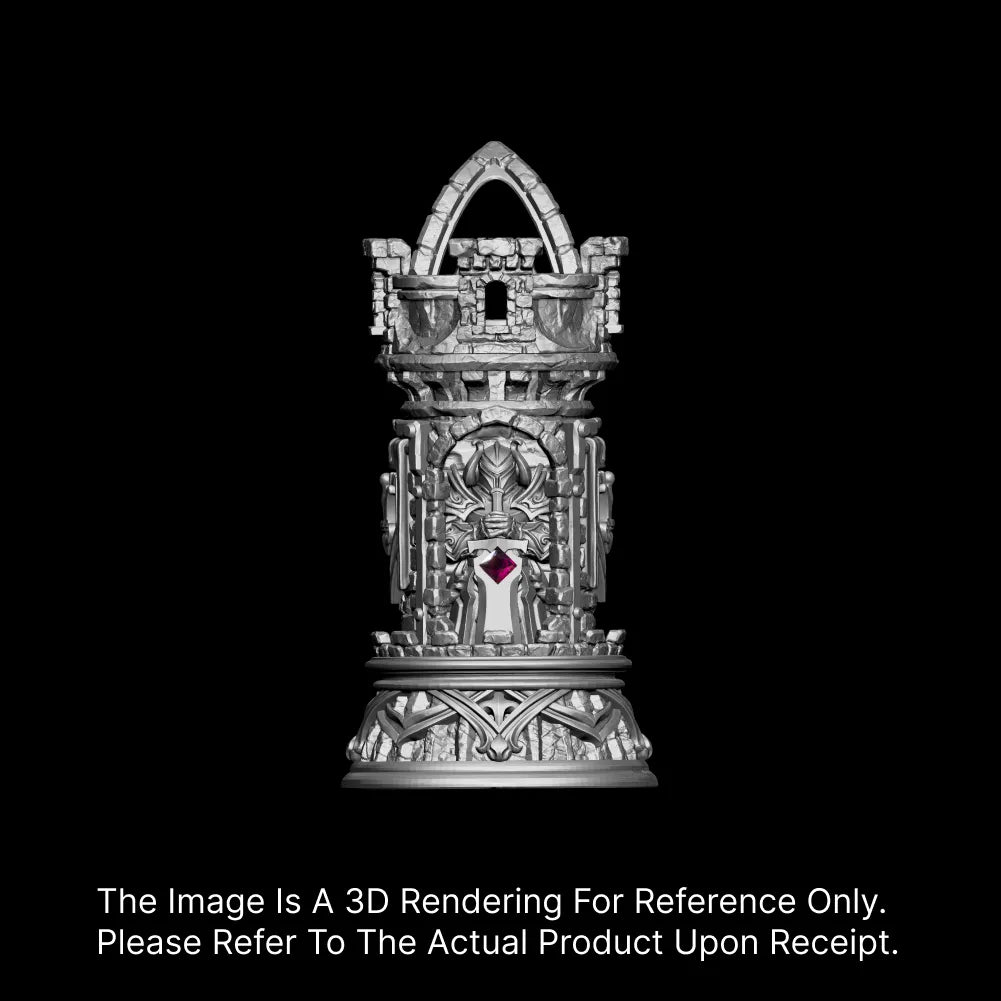 They say a fortress is built when the world feels unsafe — but wearing one? That's for those who turn fear into focus. The Turning Keep Pendant draws power from medieval strongholds, the quiet strategy of chess, and the eternal duel between outward ambition and inward control. Inspired by the archetype of the rook and the psychological push-pull between courage and restraint, this pendant blends symbolic depth with wearable presence. On one face: a ruby-studded sword that speaks of charge-ahead valor. On the reverse: a sapphire-embedded shield, embodying patience and inner mastery. Between its crown and dragonbone base lies a vertical story of power perched above chaos, a reminder that every wearer stands “above glory, beneath crisis.”