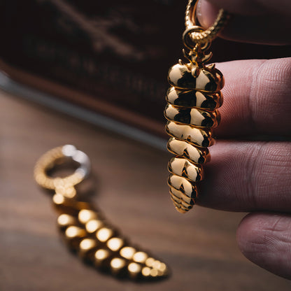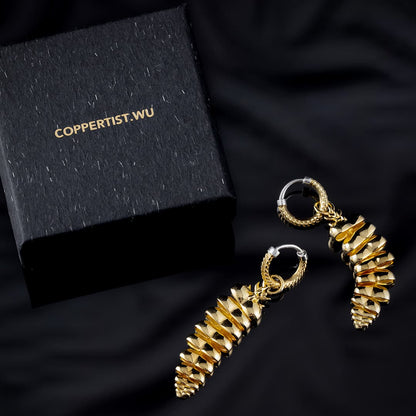 Crafted with great attention to detail, the Rattlesnake Tail Earrings are available in four different materials: Brass, Oxidized 925 Sterling Silver, 18k Gold Vermeil, and Matte Black (brass coated in matte black using vacuum plating). These earrings feature ten segments that join together to create the snake's tail, with eight of these segments able to move freely, producing a rattling sound that simulates the real rattlesnake tail. The pendant and earrings also feature intricate details of snake bones and scales, enhancing the overall design of the piece.