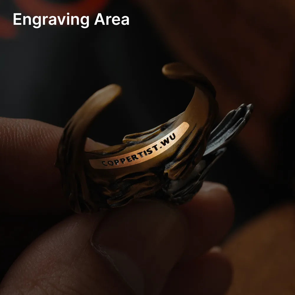 Crafted with precision, the ring features a bark-textured brass band that mimics the feel of real tree bark, while the woodpecker itself is beautifully composed of copper and white brass. The delicate copper crest and white brass body create an elegant contrast, and its 1.75mm black onyx eyes add lifelike charm, giving the woodpecker a dynamic, captivating appearance. The woodpecker's head even “pecks” when you move its tail, adding a touch of natural wonder to the ring's design.