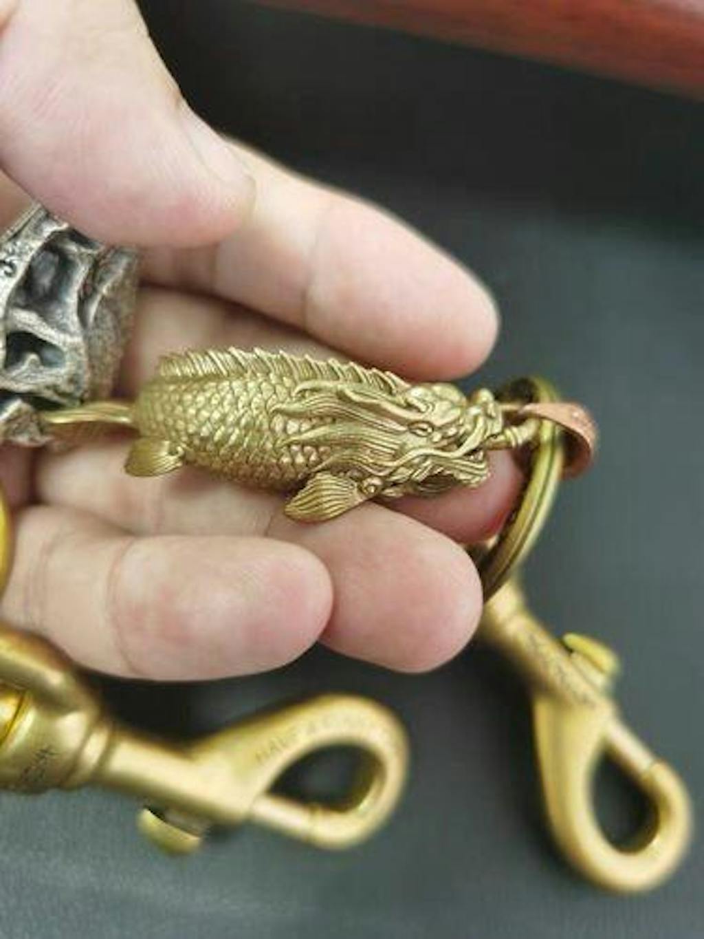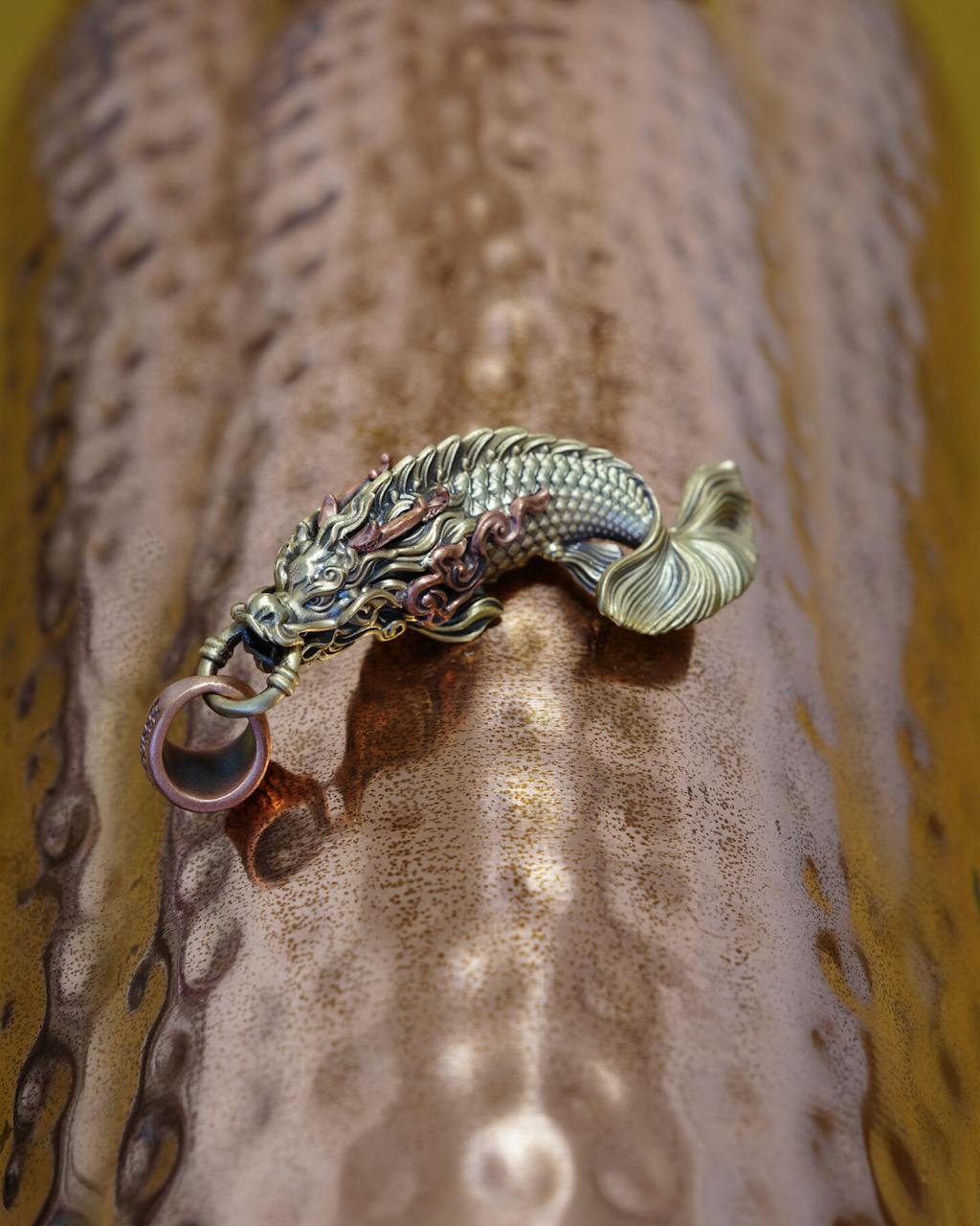 Crafted with meticulous attention to detail, the pendant features a majestic dragon's head with flowing hair and determined eyes, enhanced by copper dragon horns and intricate flame patterns. The brass body adds a layered effect, while the scales, fins, and tail are rendered with vivid precision. The broad, thick contour of the dragon's belly is designed to symbolize inclusivity and the capacity to embrace everything. Moreover, the large-diameter dragon scale button ensures the pendant can be easily paired with necklaces or keychains for convenience and versatility.