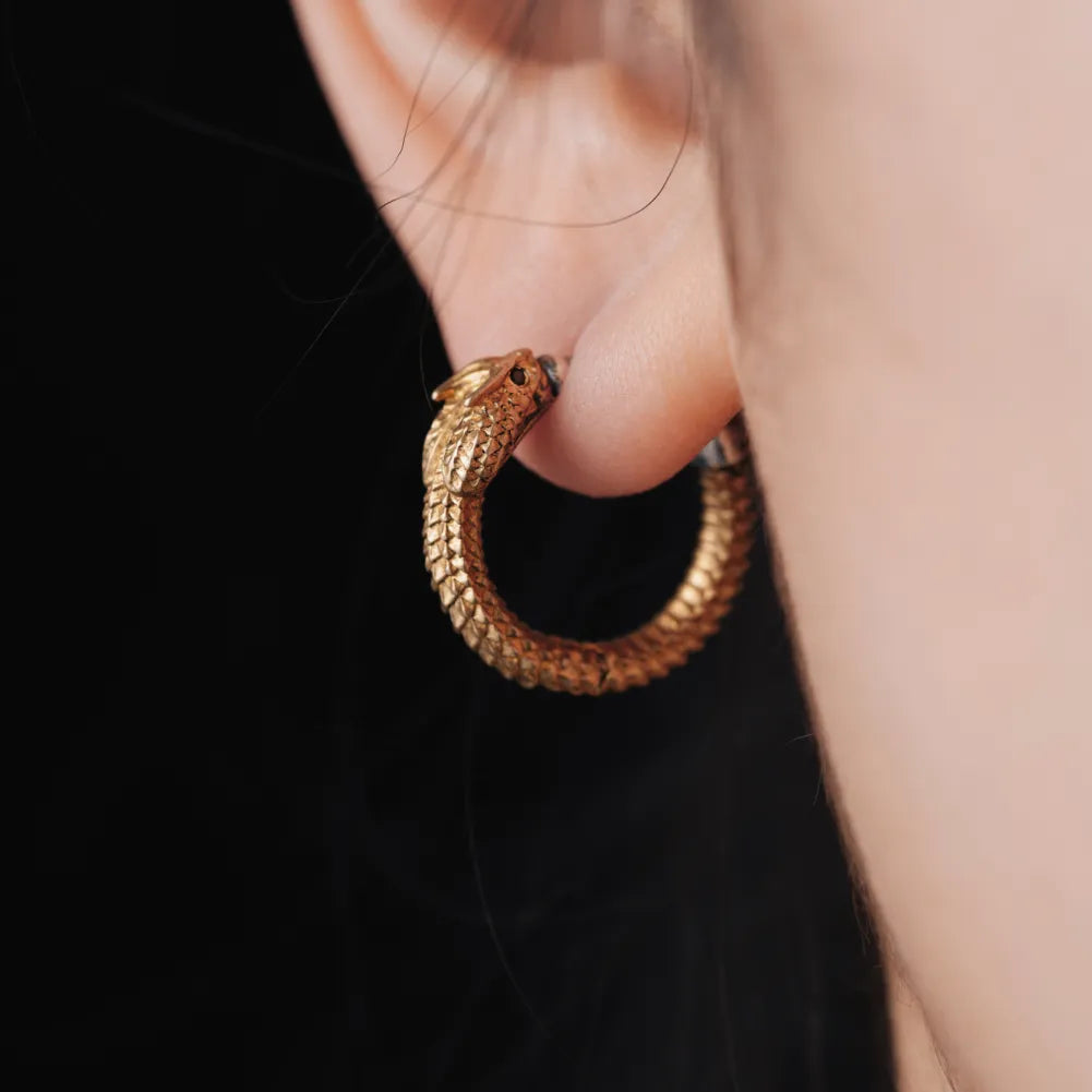 The Ouroboros Snake Earrings Brass version features hand-inlaid black zircon snake eyes that add a touch of mystique to the design. The delicate scales of the snake are also clearly visible, giving these earrings a unique and eye-catching appearance. The earring pins are made of 925 silver, which reduces the possibility of skin allergies.