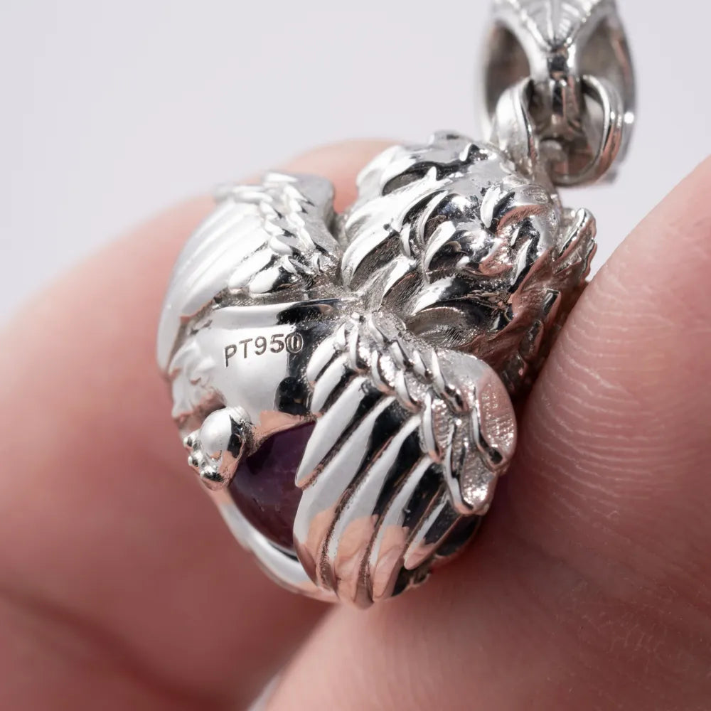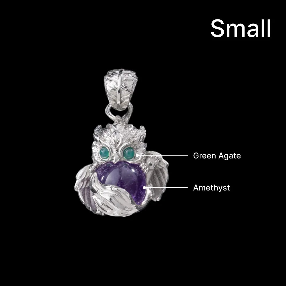 Built from four interlocking pieces—white brass, yellow brass, and red copper—this pendant is a miniature marvel of layered metalwork. The feathered clasp and leaf-shaped loop echo the wings of protection, while the core body is carved with dynamic, lifelike plumage. Nestled within its wings lies a customizable 10mm crystal "heart", pulsating with energy and having a palette of 20 stones including amethyst, turquoise, and garnet. The piercing 3mm gemstone eyes—select from amethyst, blue zircon, red ruby, black onyx, and more—give each pendant a one-of-a-kind personality. It's small, but bursting with energy and detail.