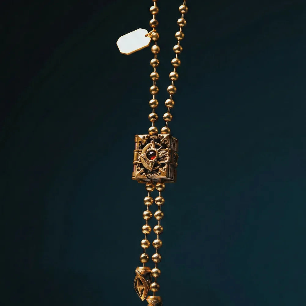 In a world where magic books don’t just record spells but shape reality, the Luna Arcana Chain Clasp turns a simple clasp into the story’s heart. Shaped like a sealed tome with openwork covers etched in forgotten runes and geometric order, it holds a vivid red core that feels alive. Open it with a smooth magnetic click, and you’ll find a small copper page waiting for your words, a name, a date, a private symbol, or your own quiet incantation. Two pen-nib pendants below complete the tale, turning the piece into more than jewelry: a personal, unfinished grimoire you carry close.