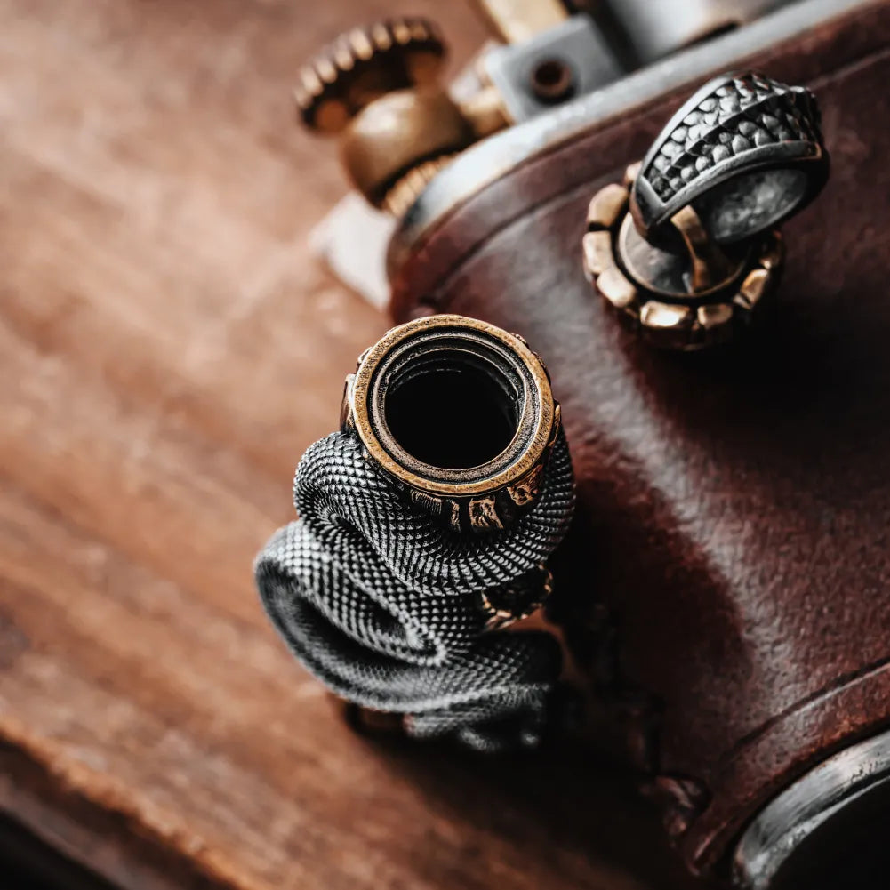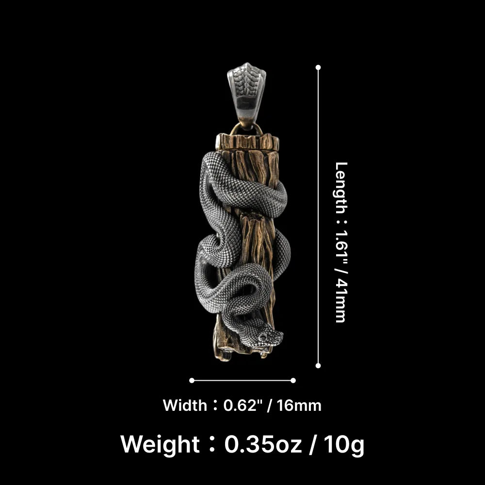 This pendant combines symbolism, sculpture, and functionality. The contrast between the white brass python and the brass tree trunk creates strong visual depth, while the carved bark texture and detailed scales give it a lifelike presence.The hidden compartment adds a personal layer to the design. It can hold small crystals, spices, ashes, or meaningful objects, turning the pendant into a private container for memories or intentions. Whether worn as jewelry or carried as a small personal talisman, it offers both aesthetic appeal and personal meaning.