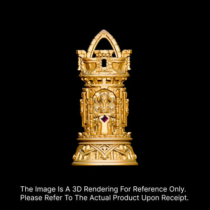 They say a fortress is built when the world feels unsafe — but wearing one? That's for those who turn fear into focus. The Turning Keep Pendant draws power from medieval strongholds, the quiet strategy of chess, and the eternal duel between outward ambition and inward control. Inspired by the archetype of the rook and the psychological push-pull between courage and restraint, this pendant blends symbolic depth with wearable presence. On one face: a ruby-studded sword that speaks of charge-ahead valor. On the reverse: a sapphire-embedded shield, embodying patience and inner mastery. Between its crown and dragonbone base lies a vertical story of power perched above chaos, a reminder that every wearer stands “above glory, beneath crisis.”