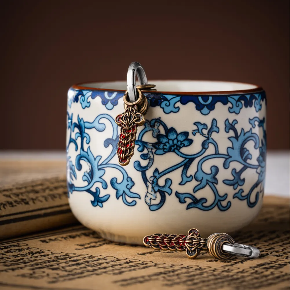 Each pair is shaped and refined by hand. The brass surface is treated to develop a slightly aged texture that echoes traditional ritual objects. Details are carefully engraved to preserve the layered structure inspired by coin arrangements, while the cinnabar accents are applied with precision to highlight symbolic points within the design.