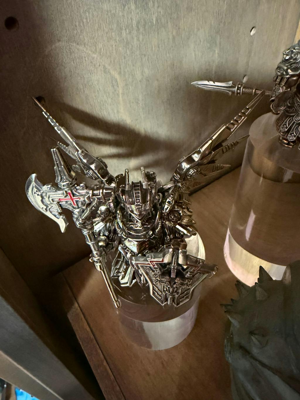 Each part is cast in white copper, polished individually, and assembled by hand. The process preserves the sharp linework of the armor, the mechanical ribs, and the crisp edges on the wings and weapons. Every magnet is placed manually to ensure smooth assembly and satisfying resistance.