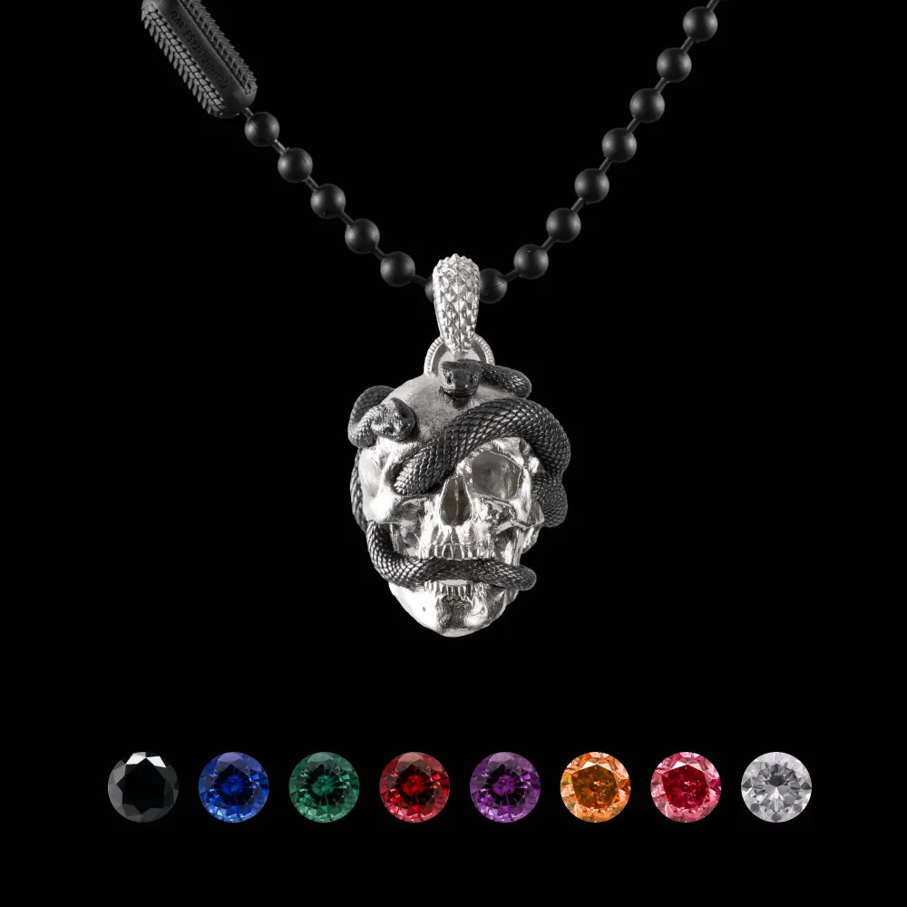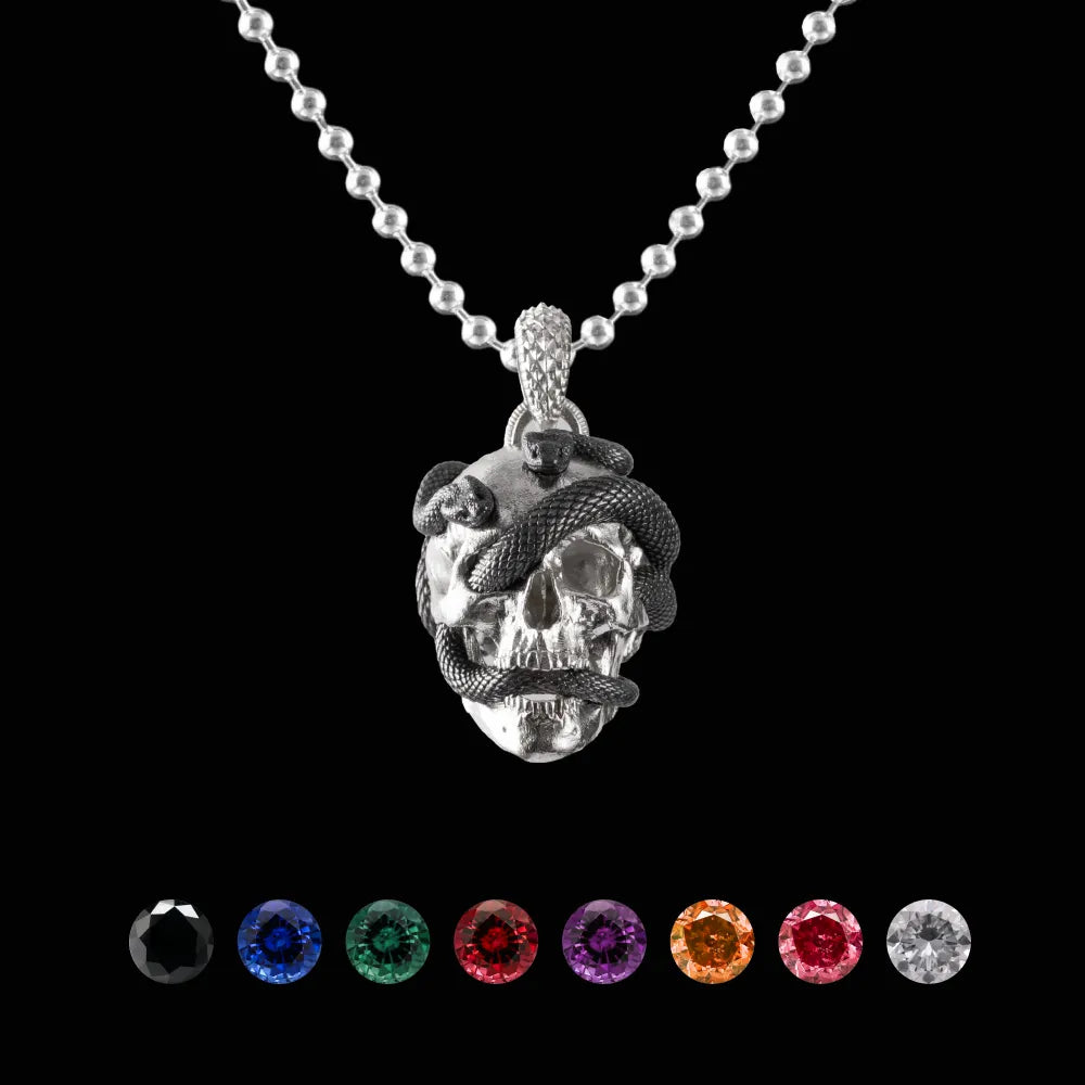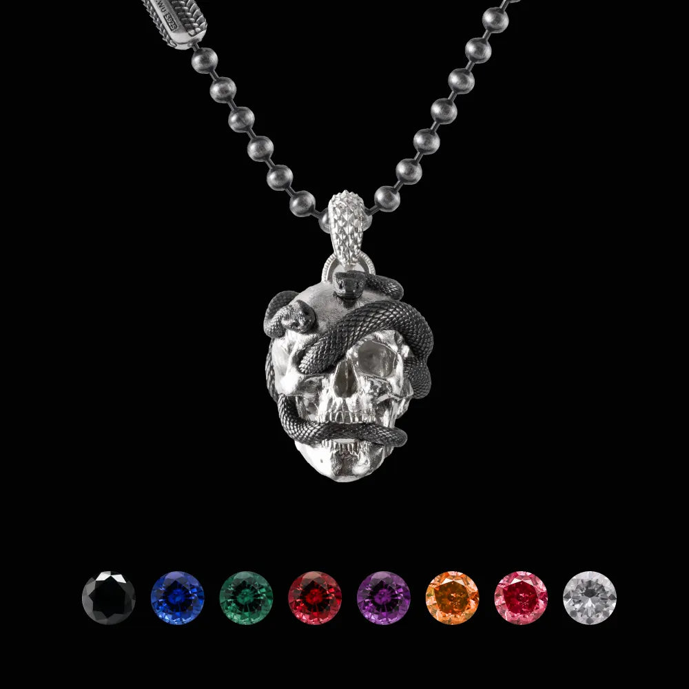 Drawing inspiration from the profound concept of reincarnation, the Skull Snake Pendant elegantly marries symbolism with style, where the skull signifies the cycle of death and the snake embodies the journey of rebirth. A poignant embodiment of life's fleeting nature, this pendant serves as a cherished keepsake, urging us to treasure every moment and the memories of those we hold dear.