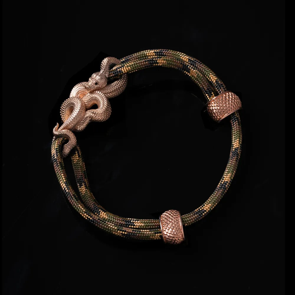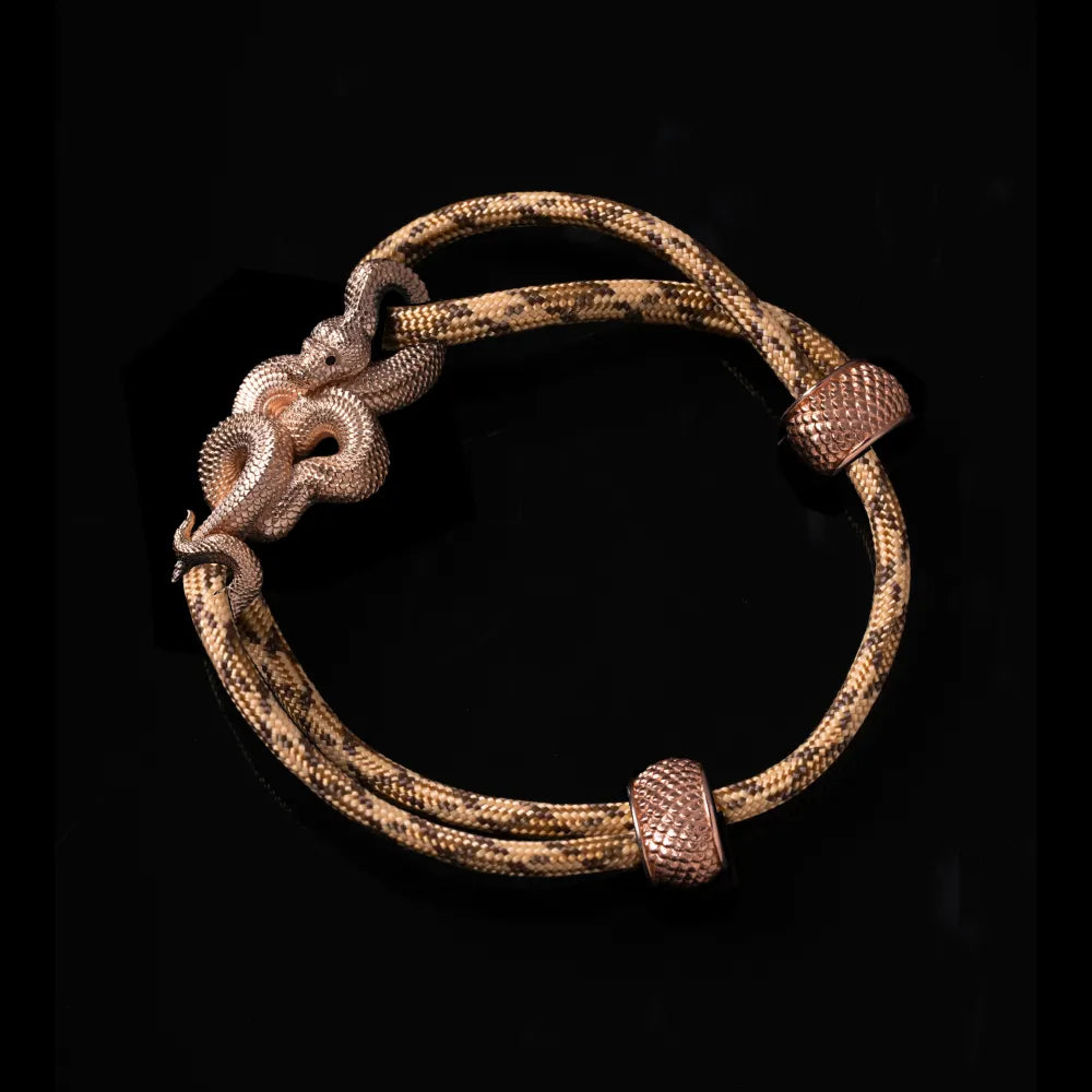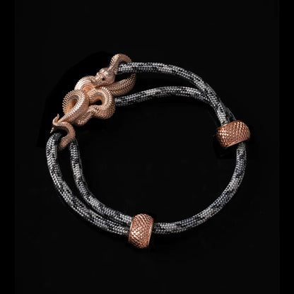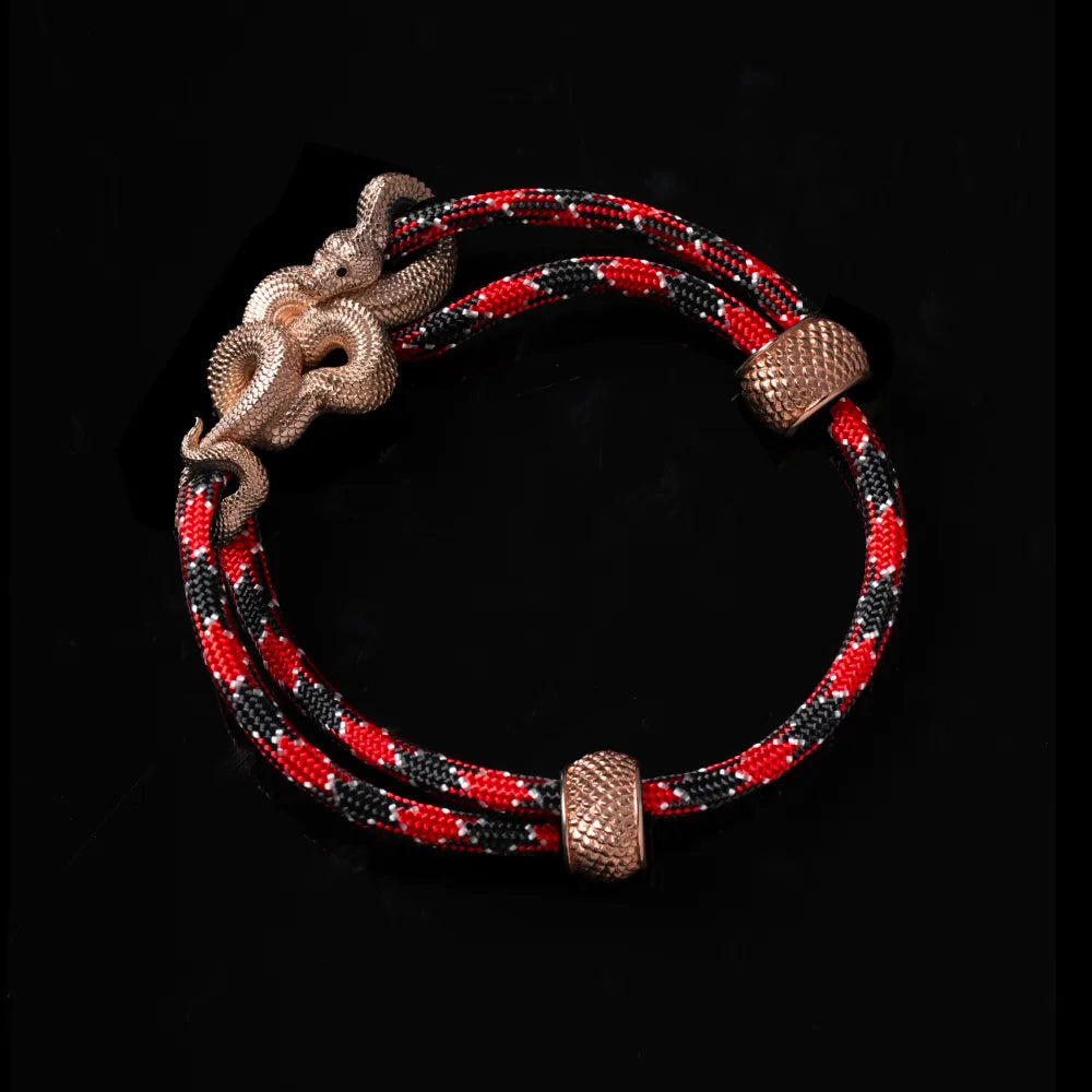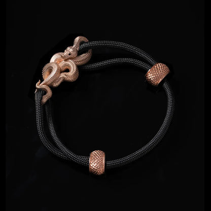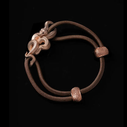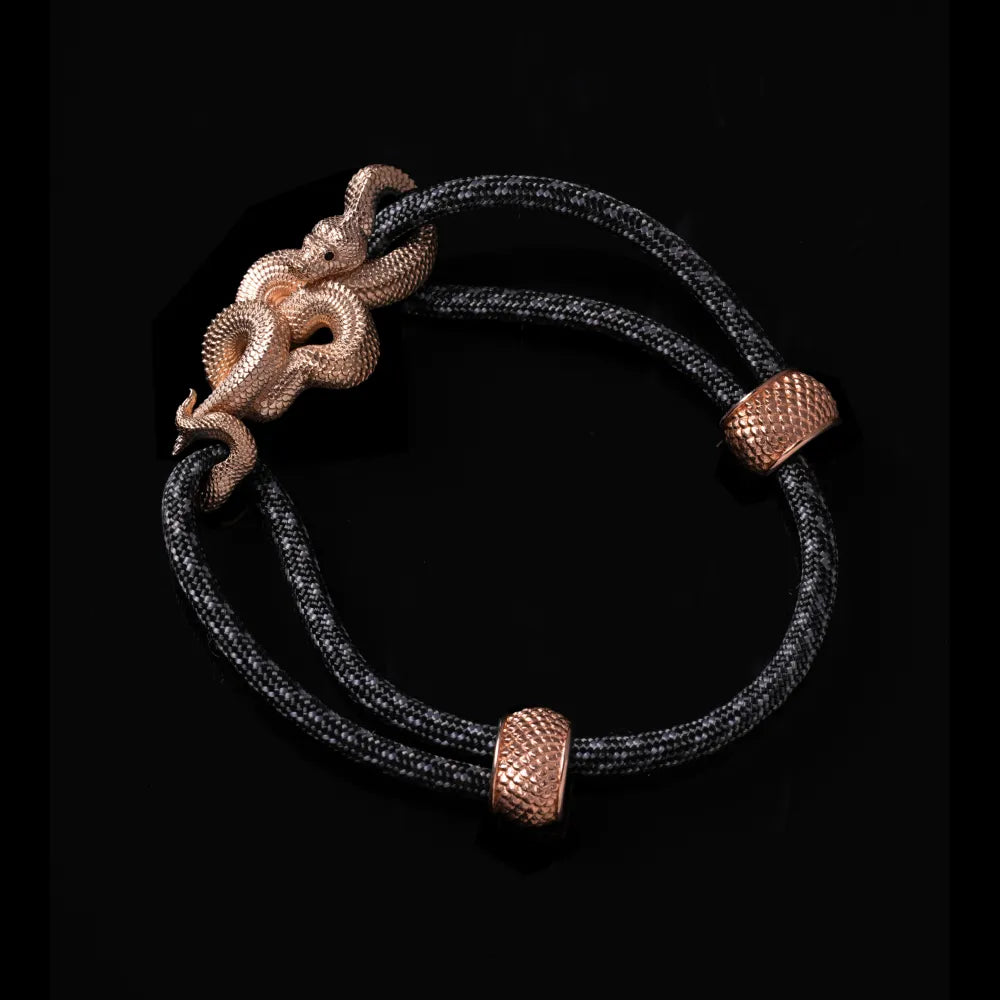Meticulously handcrafted, every layer of the boa's coiled body is sculpted to perfection, ensuring depth, texture, and an almost lifelike presence. The snake's face, refined through multiple sculpting adjustments, features an openwork mouth for a heightened sense of realism and dominance. Its piercing 1mm black onyx eyes, set by hand, give an intense, watchful gaze, elevating its lifelike appeal. The bracelet is completed with a durable 4mm Milan cotton rope, fully adjustable for a custom fit, allowing wearers to personalize both size and color.