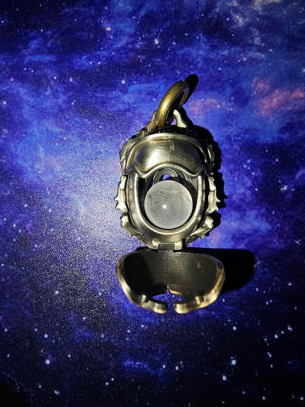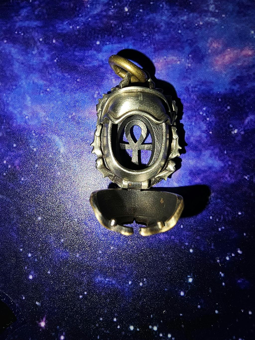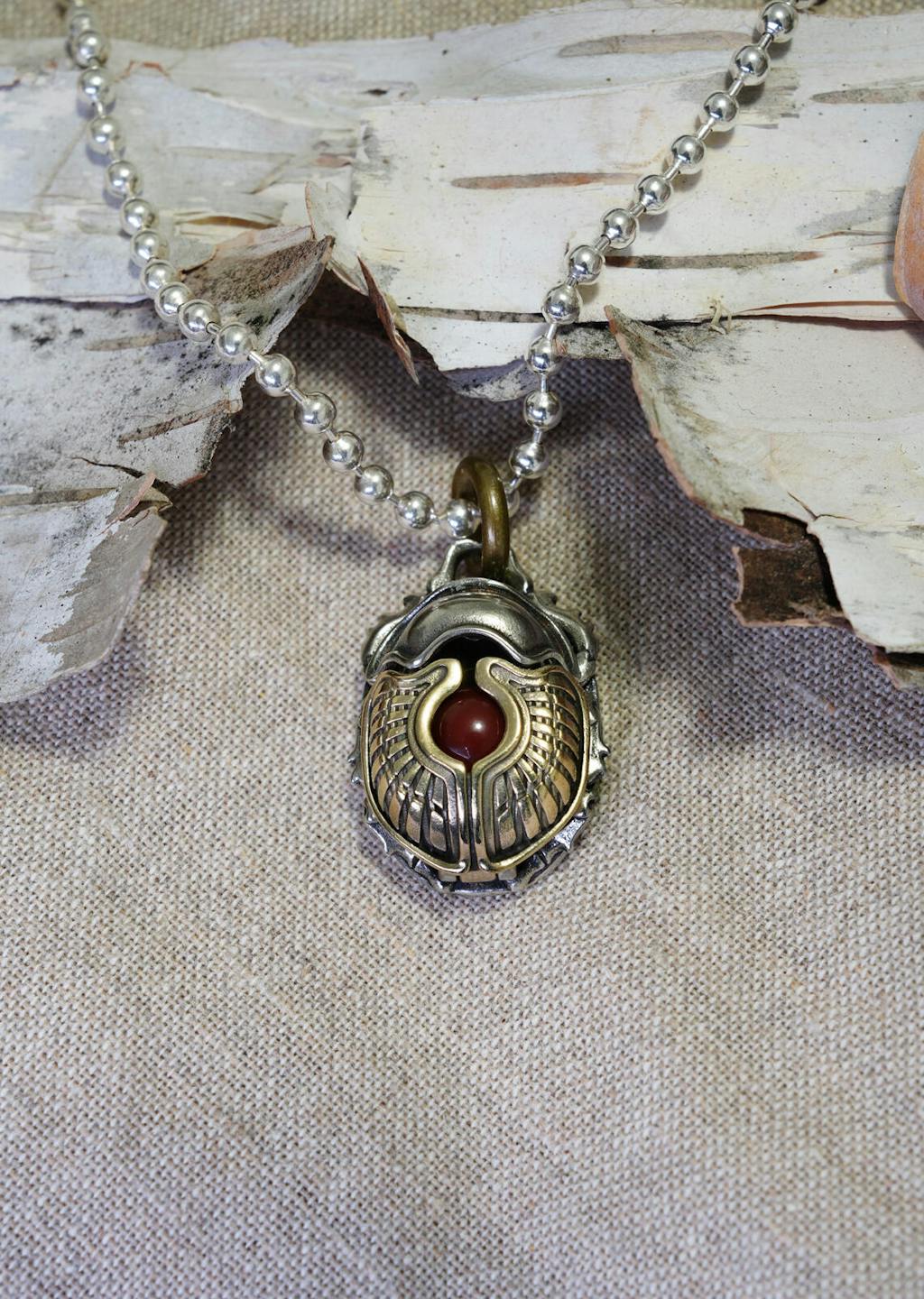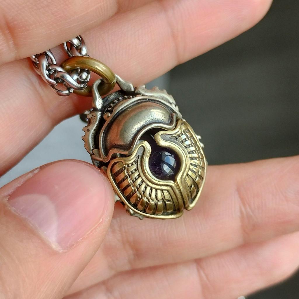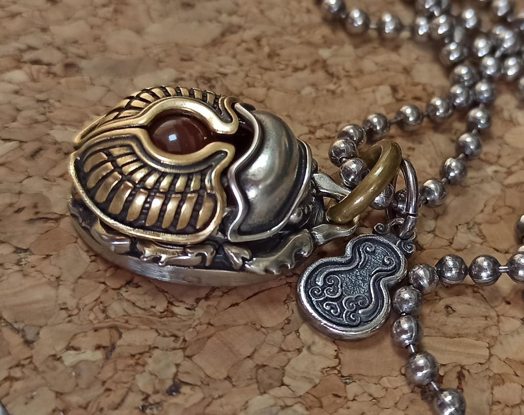 This pendant showcases meticulous craftsmanship, blending brass and white brass to create a striking layered design. Its hollow scarab shell features a clever mechanism: press the white brass head to activate a hidden latch, allowing the brass shell to open. Inside, a dedicated space accommodates an 8mm energy stone of your choice, designed for seamless customization.