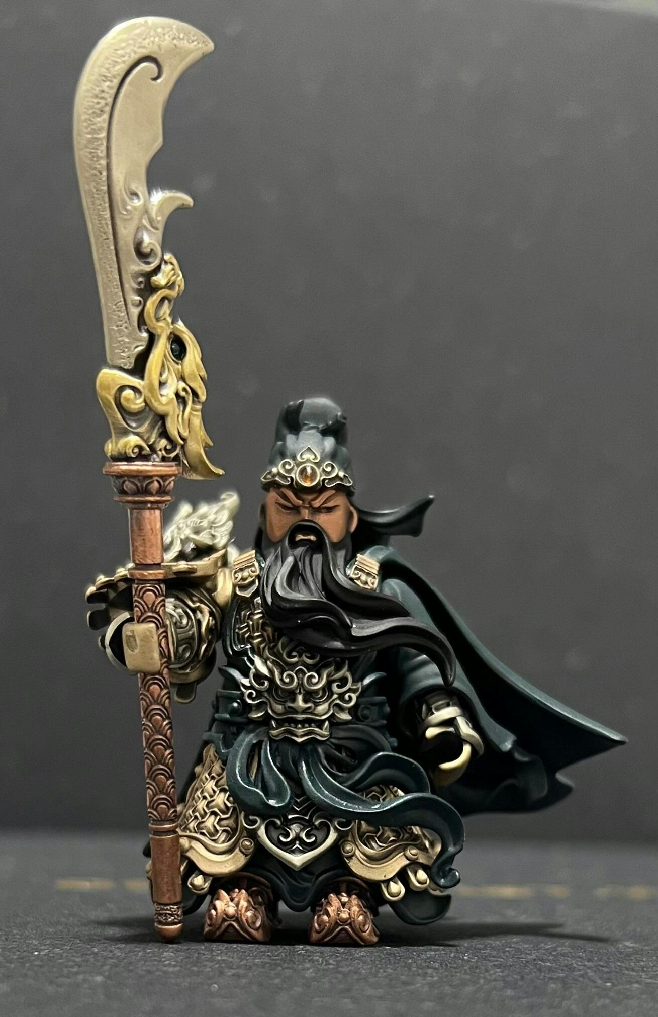 A simple cut over such a small area of face make Guan Yu stand out splendidly. The paintwork amplified the same remarkable details on the body armour. The cape & head gear is simply wonderful. Picture cannot produce the real beauty of actual product. Thank you for all the efforts in bringing Guan Yu to the display table❤️