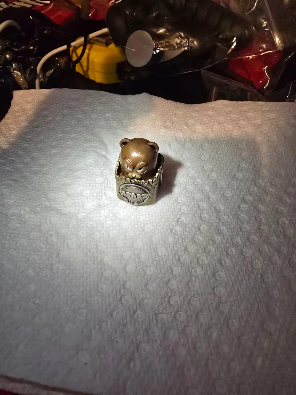 Masterfully crafted with 3D printing and direct casting, this piece achieves a level of detail that traditional molds simply can't replicate. The mole's head is made of purple copper, with expressive facial features carefully pieced together from brass and white copper, creating a lifelike effect. The burrow mimics cracked earth in brass, enhanced by retro-style engravings for an authentic aged look. Topped off with game-inspired details like the iconic start button and logo, it's a miniature work of art with an interactive twist.