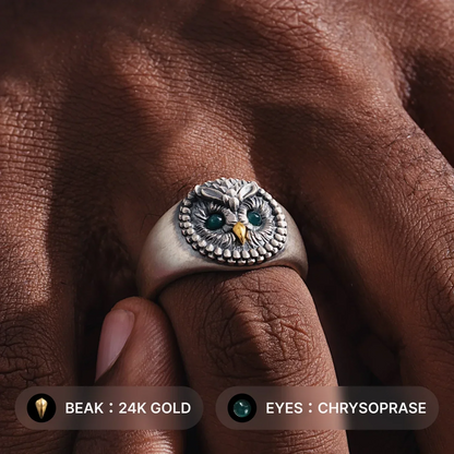 This ring captivates with its intricate and delicate appearance, achieved through layered feathers. In the silver version, the owl's Platinum beak adds depth and allure to the overall design. The silver variant features captivating chrysoprase gemstone eyes, bestowing a deeper, more soulful gaze.