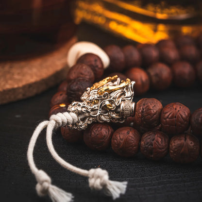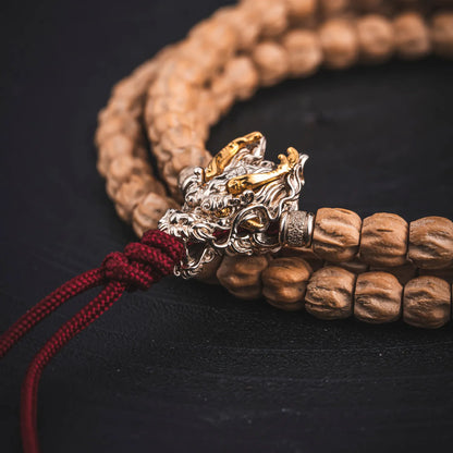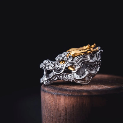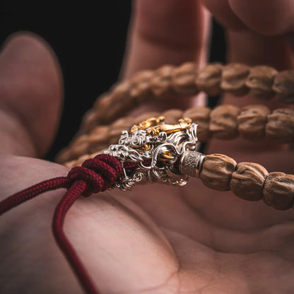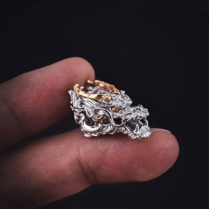 Crafted with exceptional attention to detail, the Dragon Three-Way Bead features a majestic dragon's head with fierce eyes and intricate curves, showcasing exquisite craftsmanship. Made primarily of 925 silver with brass accents, the bead combines materials with different melting points, manually inlaid with precise temperature control. The contrast of silver and brass creates a striking visual appeal, and the meticulous craftsmanship ensures each bead is a unique work of art.