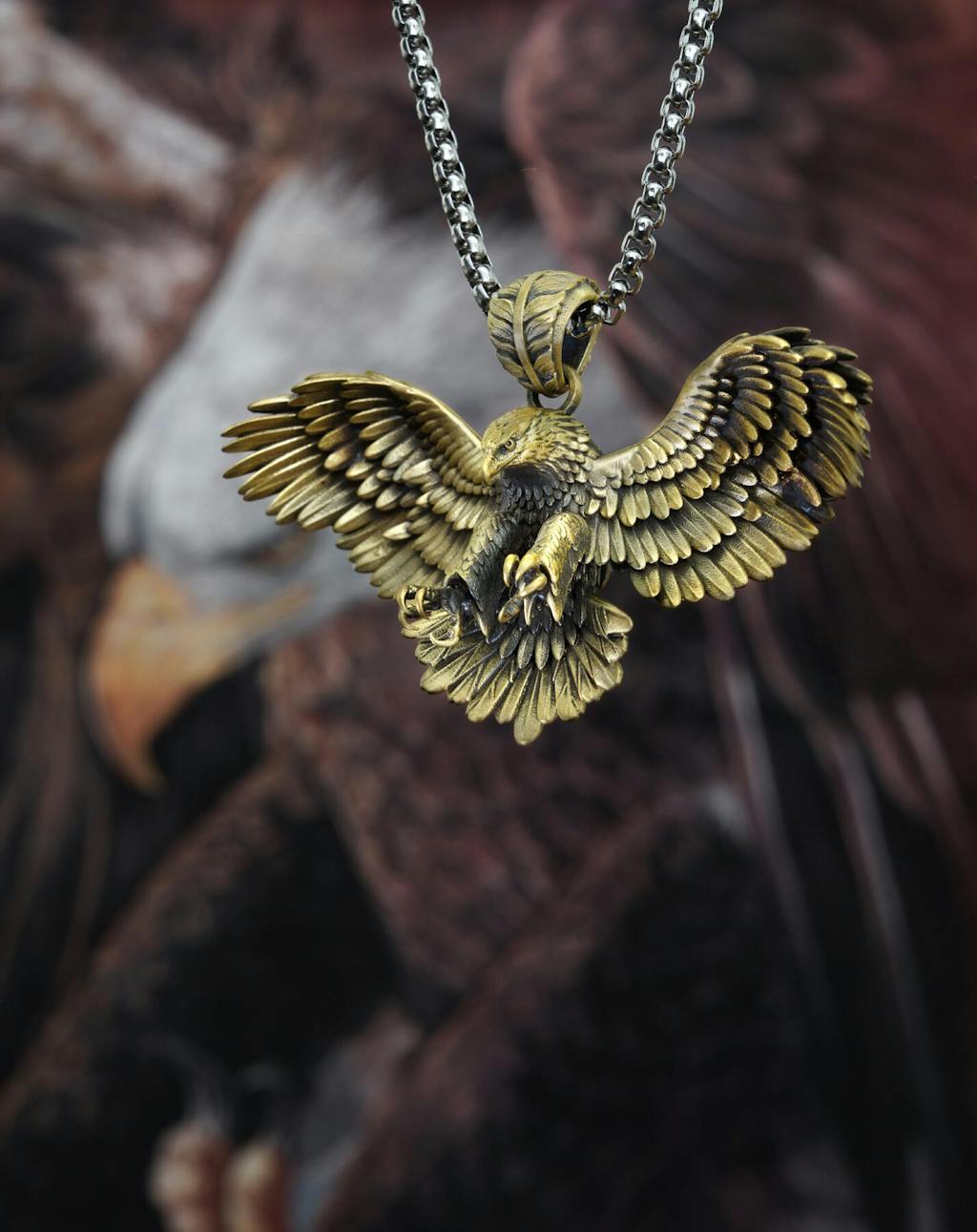 Expertly crafted with lifelike details, the pendant captures the eagle's fierce gaze and dynamic form. The realistic beak and claws are thoughtfully curved inward to ensure safety and comfort, preventing any potential skin scratches while preserving the pendant's striking appearance.