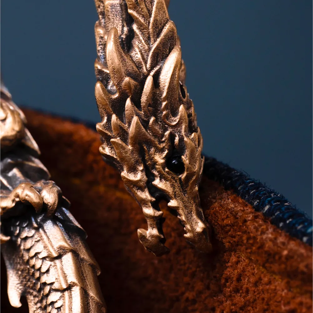 Built with meticulous craftsmanship, this piece blends warm brass for the dragon's body and cool white brass for the wings, creating a striking dual-tone contrast that balances natural strength with futuristic edge. The dynamic "S" hook form isn't just stylish—it's functional, with multiple points for attachment. Each eye is set by hand with 1mm black agate stones, giving the dragon a sharp, lifelike gaze full of intensity. Pair it with keyrings, necklace chains, parachute cords, or leather straps—it's engineered for both aesthetics and action. Making the two metals flow seamlessly, while embedding stones on both sides of the head? That's no small feat.