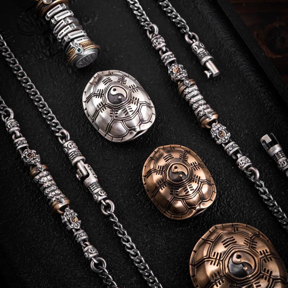 The Turtle Shell Divination piece is crafted with precision and versatility. It features a unique opening mechanism that allows the shell to open and close effortlessly with a press on the opposite end. Available in a size combination set, the large version is perfect for home display, while the smaller, portable version can be paired with a special lanyard for easy carrying. The mini version enhances portability, making it ideal for personal wear. The shell's belly, crafted from brass and S925 silver, and the intricately designed Yongle Tongbao coin, highlight the fine artistry and attention to detail.
