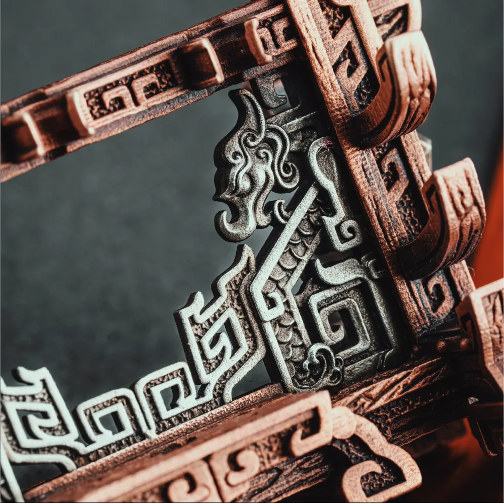 The inner structure of the stand is inspired by Han Dynasty dragon-shaped jade pendants, featuring powerful and fluid lines that add a regal touch. Made from purple copper and white brass, it consists of eight precisely assembled components, each hand-inlaid with remarkable craftsmanship. The realistic wood-grain design enhances its authenticity, creating a stand that is both functional and visually striking.