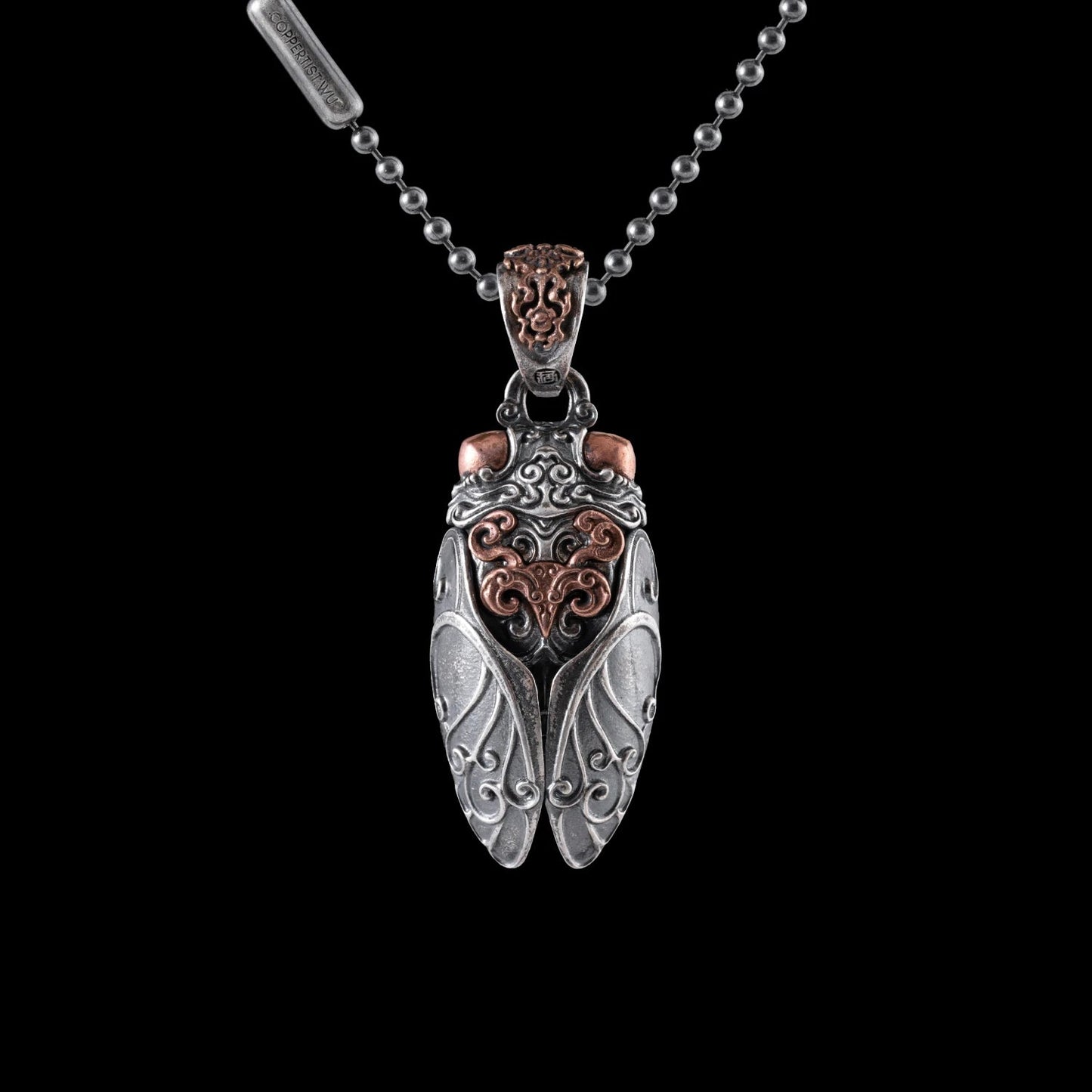 Crafted meticulously, this pendant is an embodiment of metamorphosis. Its body, eyes, and wings are composed of various metals - brass, copper, and silver - intertwining to create a captivating three-dimensional form. The intricacies of these materials enhance the pendant's agility and aesthetic allure.