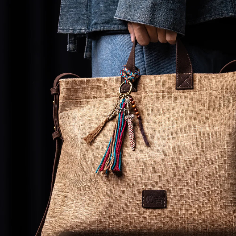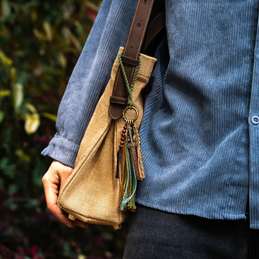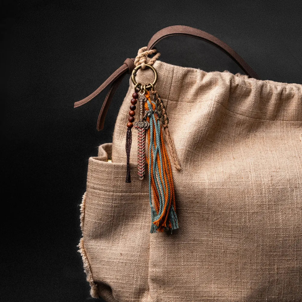 Inspired by the traditional Chinese “coin sword,” this keychain translates a symbolic ritual object into a compact, everyday form. Historically, coin swords were believed to carry protection and order, combining coins as structure and thread as connection between human intention and natural forces. This piece reinterprets that idea through aged brass and subtle cinnabar accents, preserving its cultural meaning while making it wearable. It functions not just as a keychain, but as a small personal object that represents balance, protection, and the quiet intention to attract good fortune.