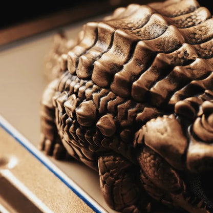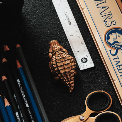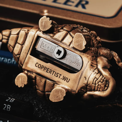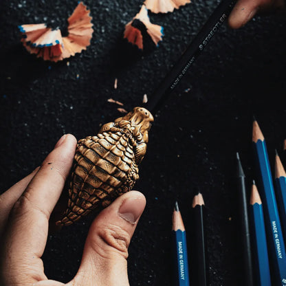 Crafted entirely from brass, this pencil sharpener boasts timeless durability and a unique patina that develops over time, enhancing its aesthetic appeal. Each piece is a work of art, with high-quality German M+R blades ensuring sharp and long-lasting performance. The intricate details, from the angry expression to the textured skin, highlight the exquisite craftsmanship, transforming this practical tool into a whimsical desk ornament that blends form and function seamlessly.