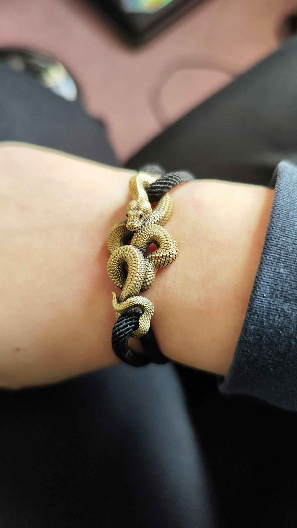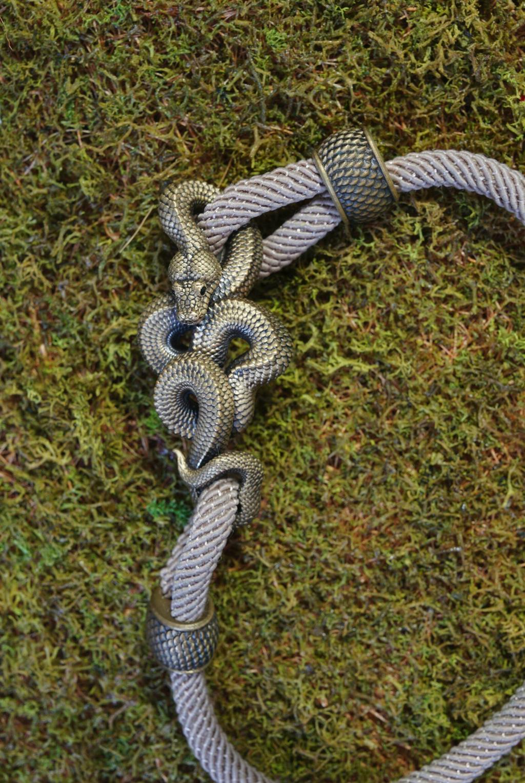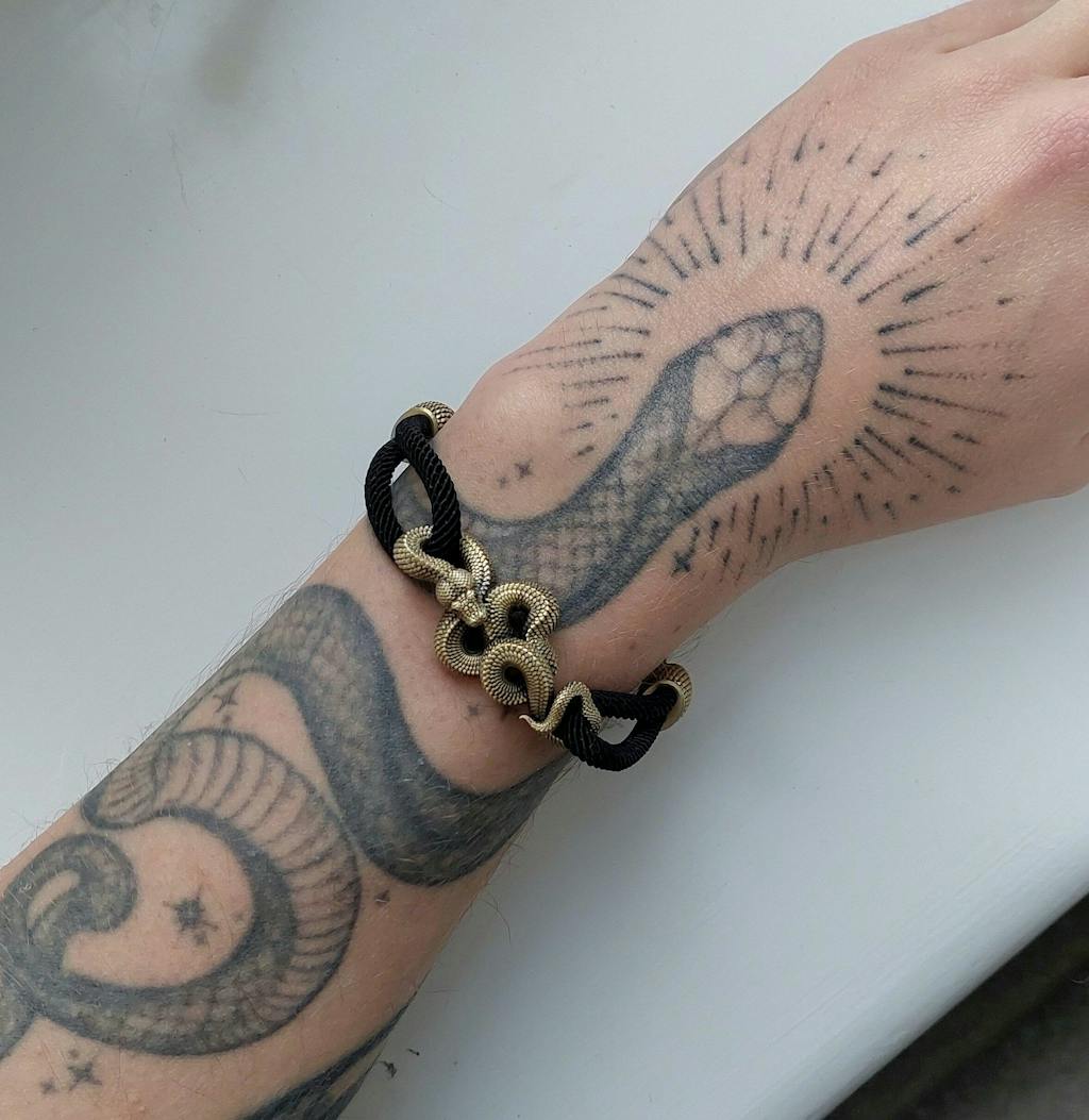 Meticulously handcrafted, every layer of the boa's coiled body is sculpted to perfection, ensuring depth, texture, and an almost lifelike presence. The snake's face, refined through multiple sculpting adjustments, features an openwork mouth for a heightened sense of realism and dominance. Its piercing 1mm black onyx eyes, set by hand, give an intense, watchful gaze, elevating its lifelike appeal. The bracelet is completed with a durable 4mm Milan cotton rope, fully adjustable for a custom fit, allowing wearers to personalize both size and color.