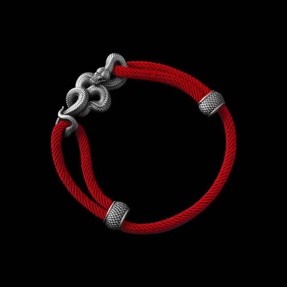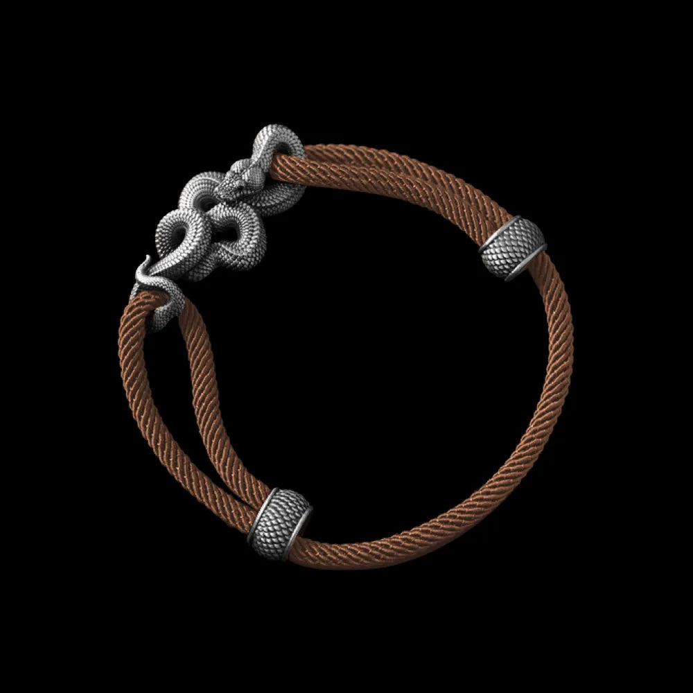 Meticulously handcrafted, every layer of the boa's coiled body is sculpted to perfection, ensuring depth, texture, and an almost lifelike presence. The snake's face, refined through multiple sculpting adjustments, features an openwork mouth for a heightened sense of realism and dominance. Its piercing 1mm black onyx eyes, set by hand, give an intense, watchful gaze, elevating its lifelike appeal. The bracelet is completed with a durable 4mm Milan cotton rope, fully adjustable for a custom fit, allowing wearers to personalize both size and color.