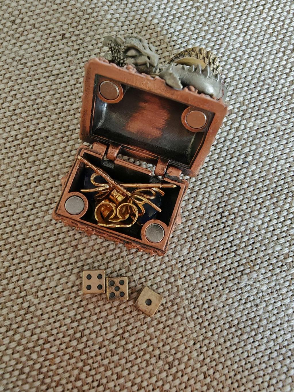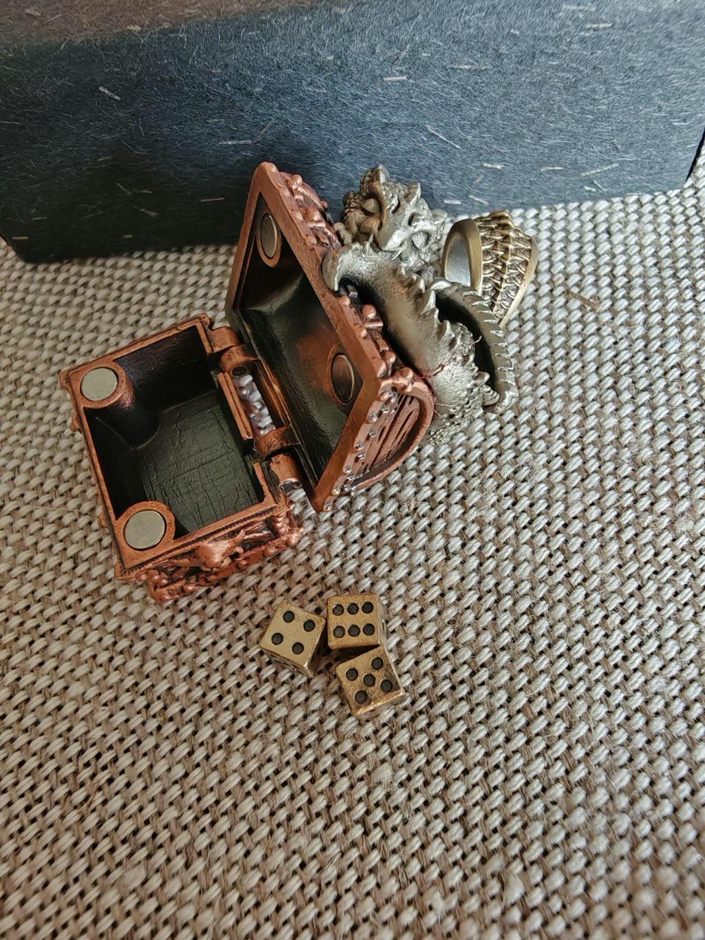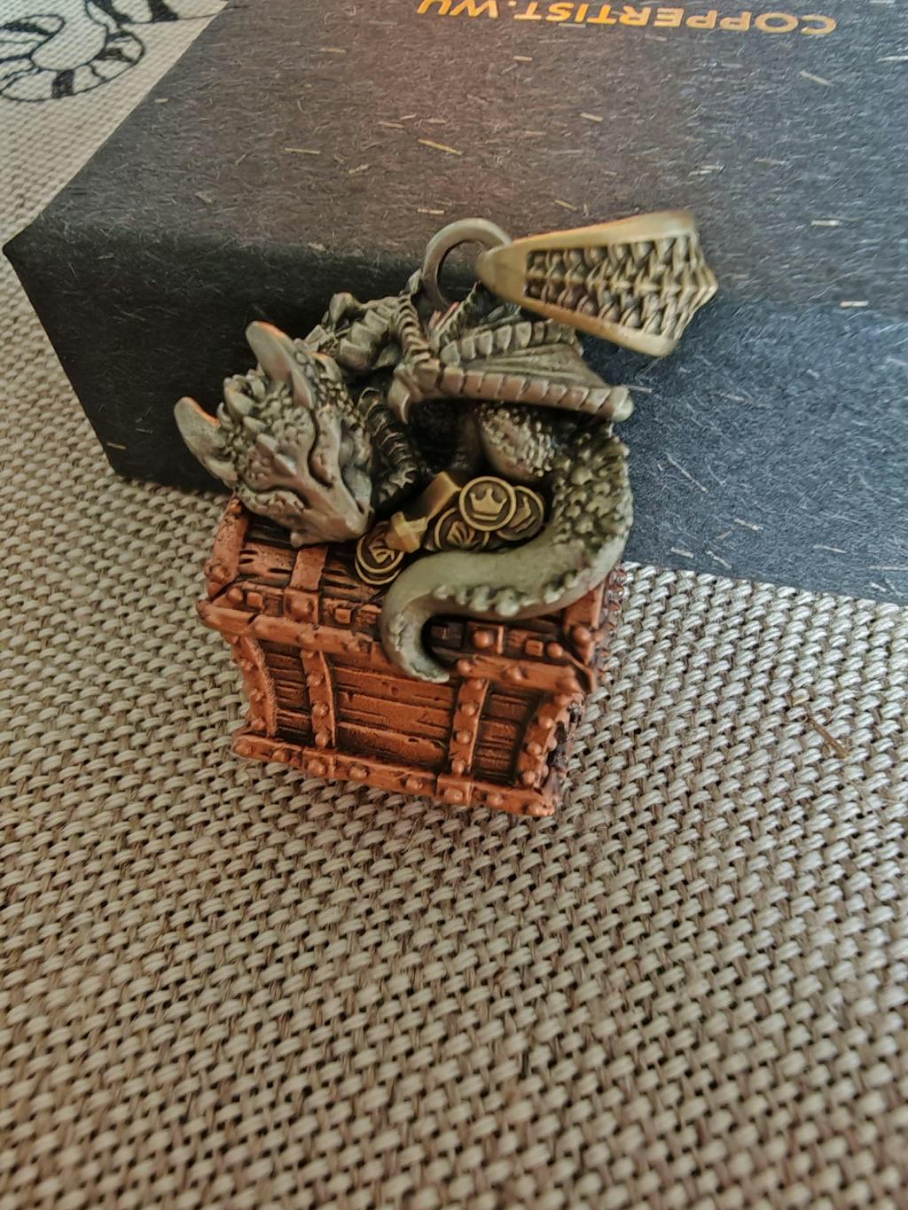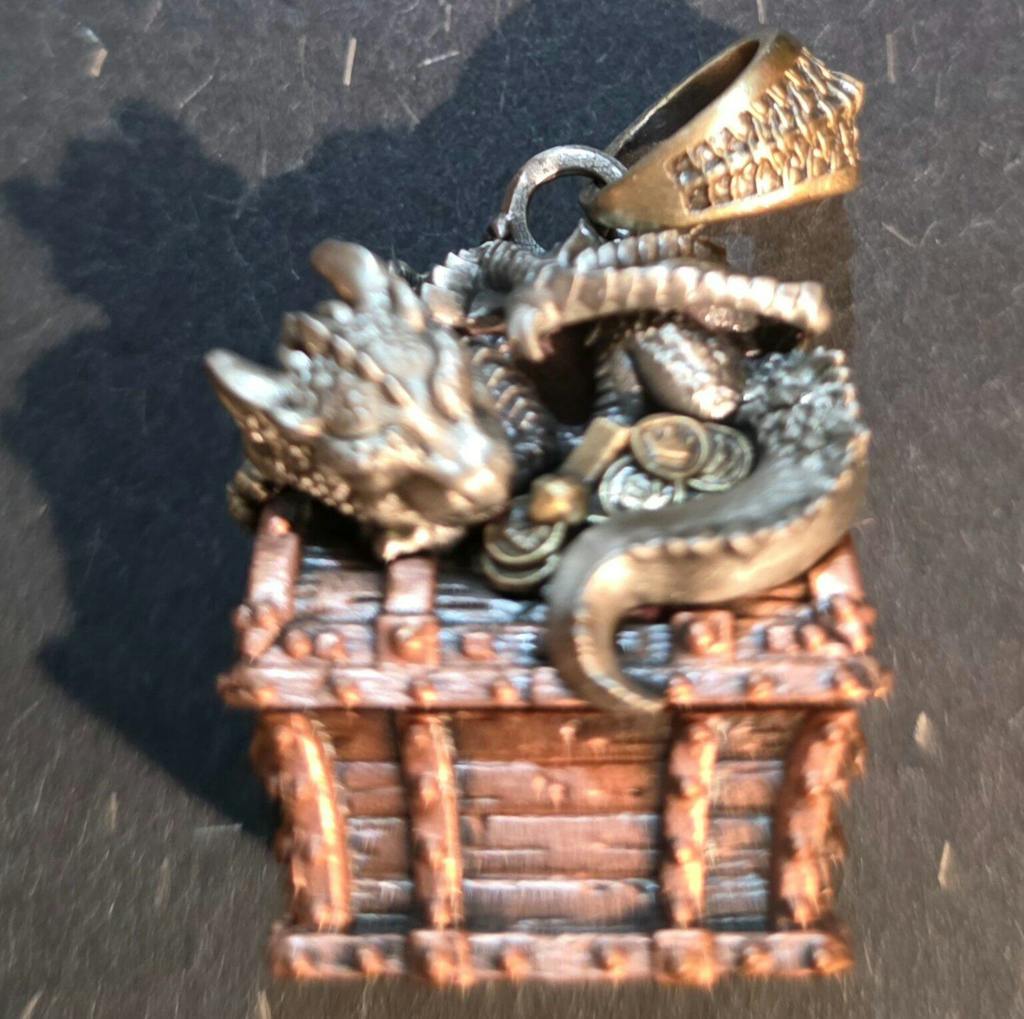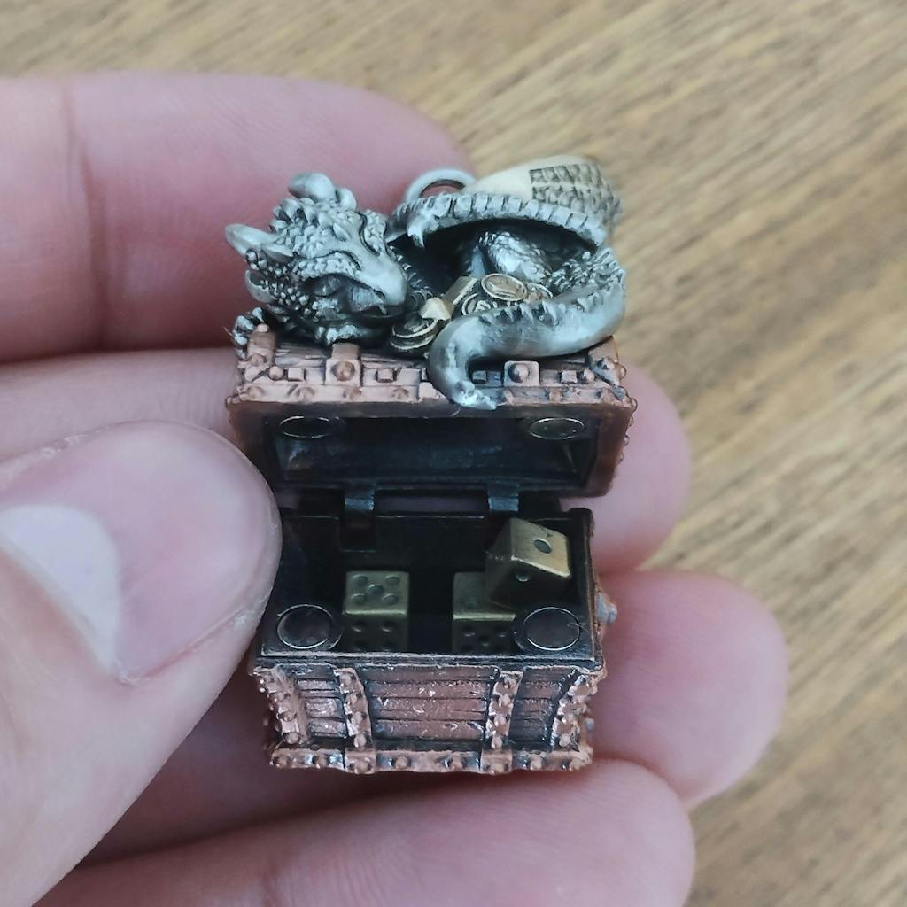 Handcrafted with meticulous attention to detail, this pendant combines three distinct metals: white copper for the dragon, purple copper for the treasure chest, and yellow brass for the coins. Every inch of this under-4cm pendant is intricately designed, from the dragon’s detailed scales and claws to the textured wooden chest, complete with skull-etched handles. The small dice inside the chest add a playful element, while the chest itself serves as functional storage for miniature keepsakes.