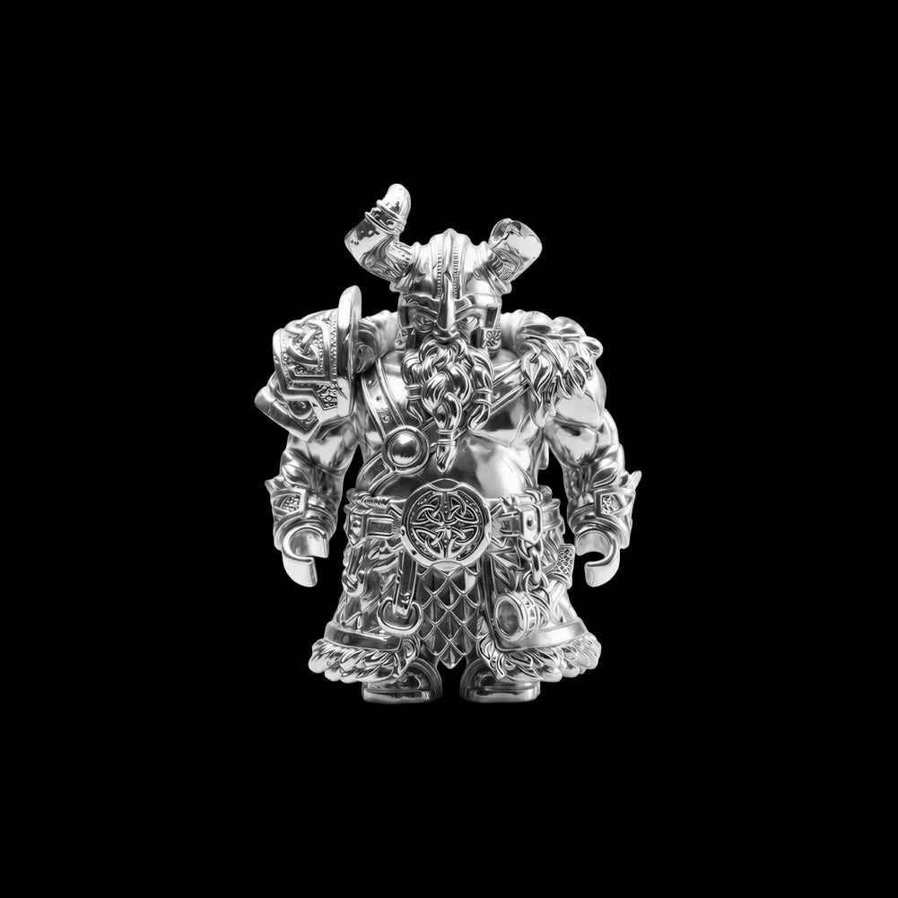 This piece feels closer to a historical artifact than a decorative figure. The weight, proportions, and worn details give it presence without dramatization. Every element, from the broken horned helmet to the scarred shield, communicates survival and authority earned over time. It’s a figure that invites inspection, reinterpretation, and interaction rather than a single fixed pose.