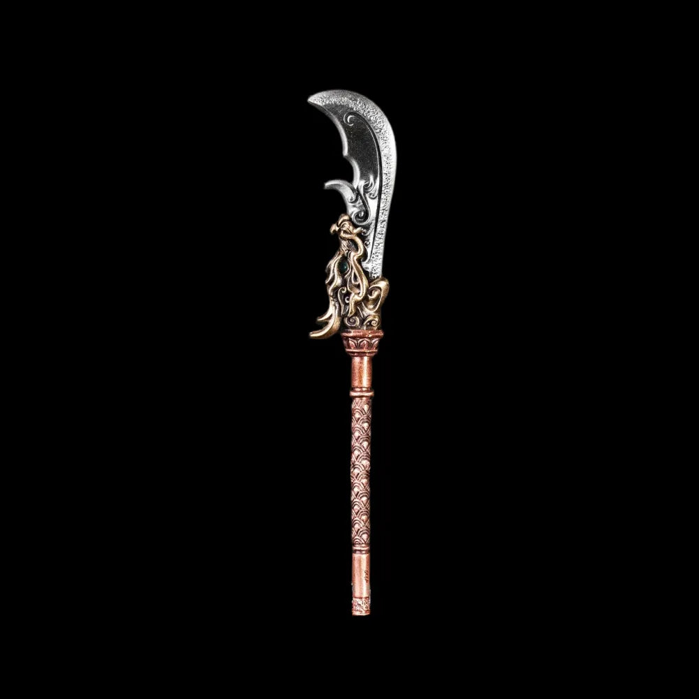 The Green Dragon Crescent Blade is a metal art piece inspired by Guan Yu, a figure whose image has endured for centuries as the embodiment of loyalty, righteousness, and moral strength. Rather than depicting him in motion, this design centers on power held in stillness. The form reflects the presence of a martial saint standing firm, calm, grounded, and unyielding. Traditional features such as the phoenix eyes, long beard, heavy armor, and the iconic crescent blade are preserved, while the posture and proportions emphasize balance and restraint. This is not a moment of battle, but an eternal state of resolve, an object that carries cultural memory and quiet authority into the present.