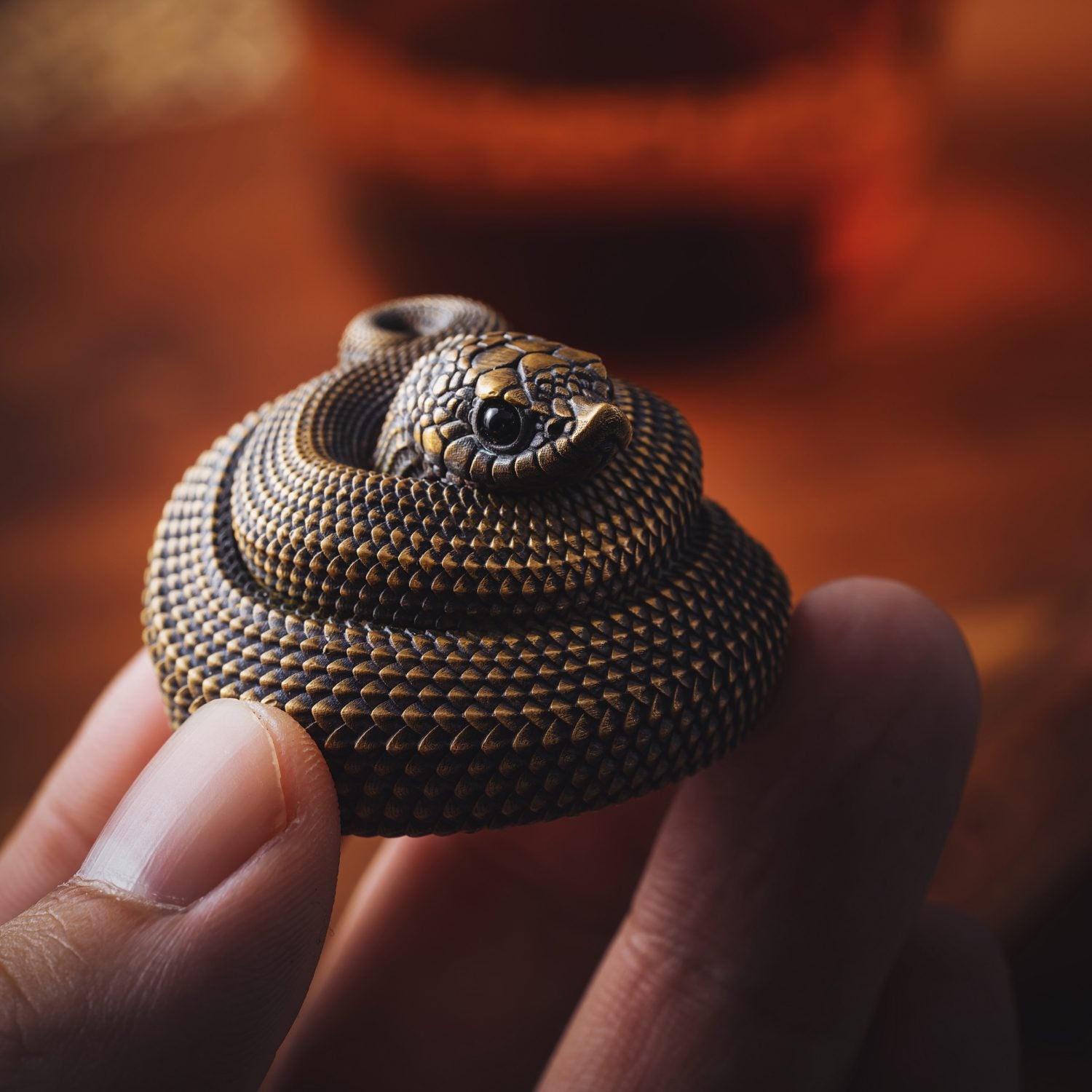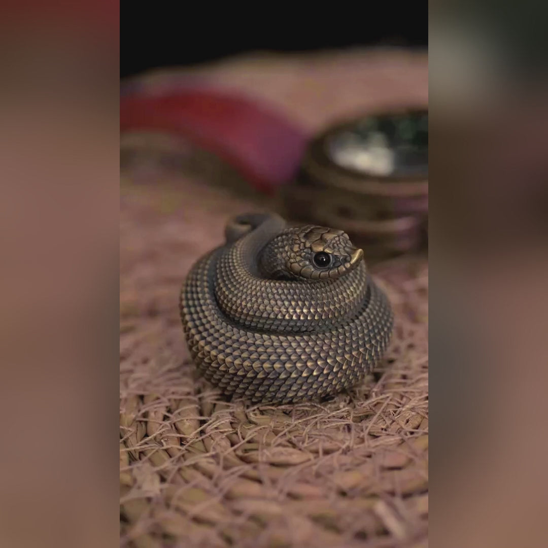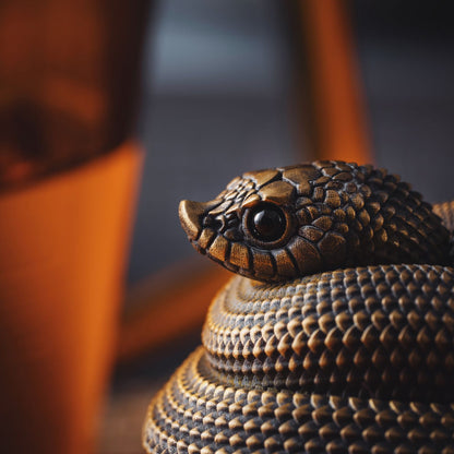 This incense holder seamlessly combines artistic excellence with practical functionality. It flawlessly captures the distinctive features of the hognose snake, including its expressive large eyes, upturned nose, and finely detailed scales. The eyes, crafted from black agate, add a realistic touch to the snake's visage. Tailored for reptile enthusiasts, art collectors, and home decor aficionados, this dual-purpose creation is a testament to the fusion of artistry and utility.